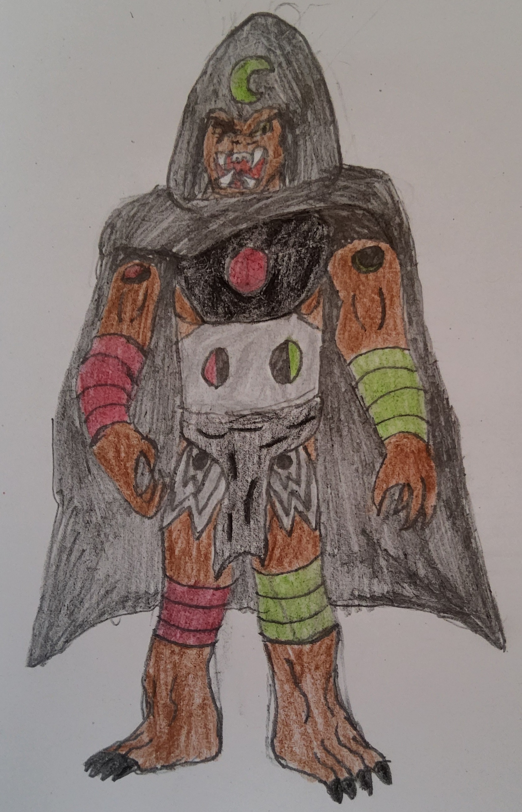 green and red Bandages, dark grey cloak with hood, grey battle-rock, black and silver chestblates