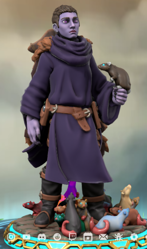 A long dark purple robe with a brown belt and hood that covers his entire head