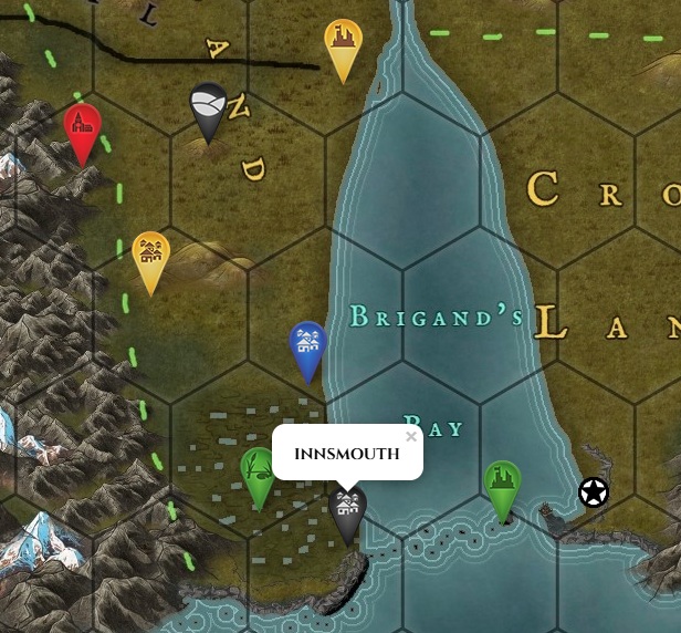 Innsmouth is a small fishing village located at the southwest corner of Brigand's Bay just before the bay empties into the Strait of Storms across the Dragon's Teeth reefs.