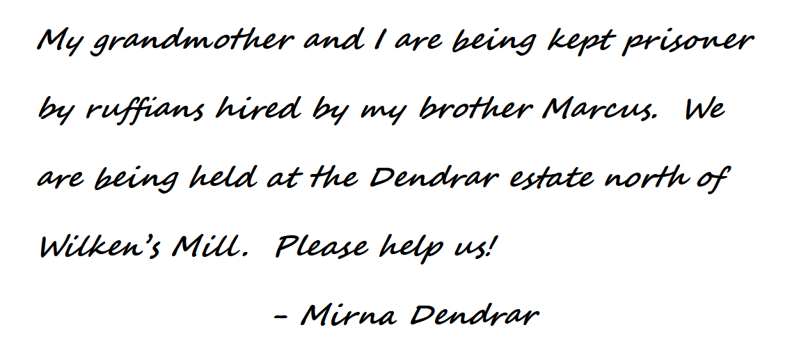 - Continuing on to town, the party visited Dame Wilkendal, who ave them directions to the Dendrar estate. It turned out to be near where the party spotted a woman harvesting herbs in a gully on their first journey north.