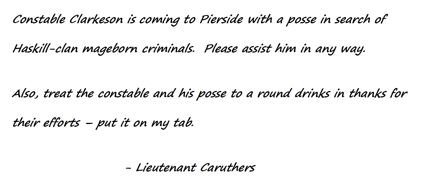 - The couriers then arrived in town. They were initially alarmed at the sight of the dead haskills, but the Constable displayed his badge of office, and explained that they were outlaws. The couriers then delivered their letter to the barkeep. The party had he constable ask to see the letter, which he handed over: