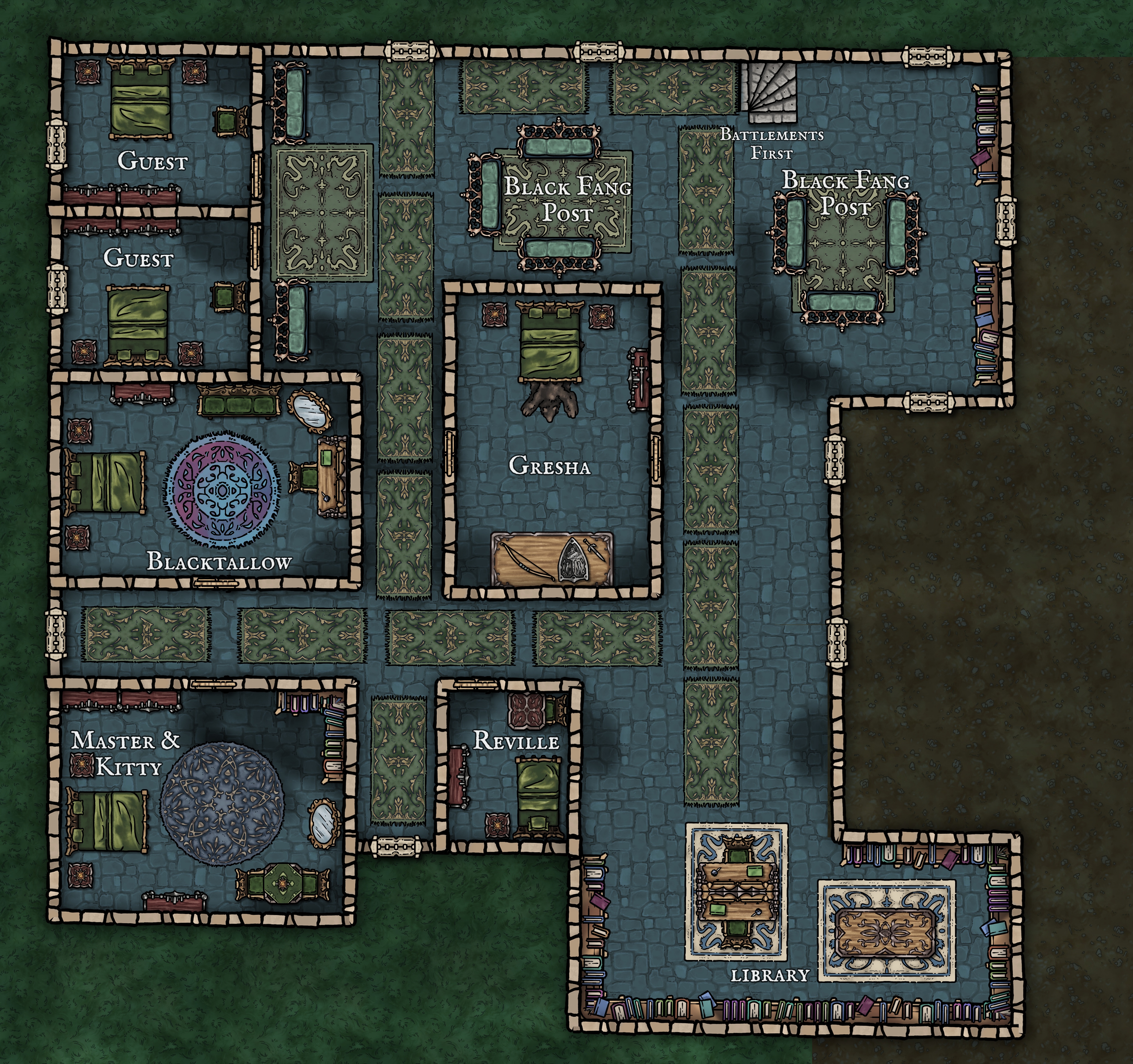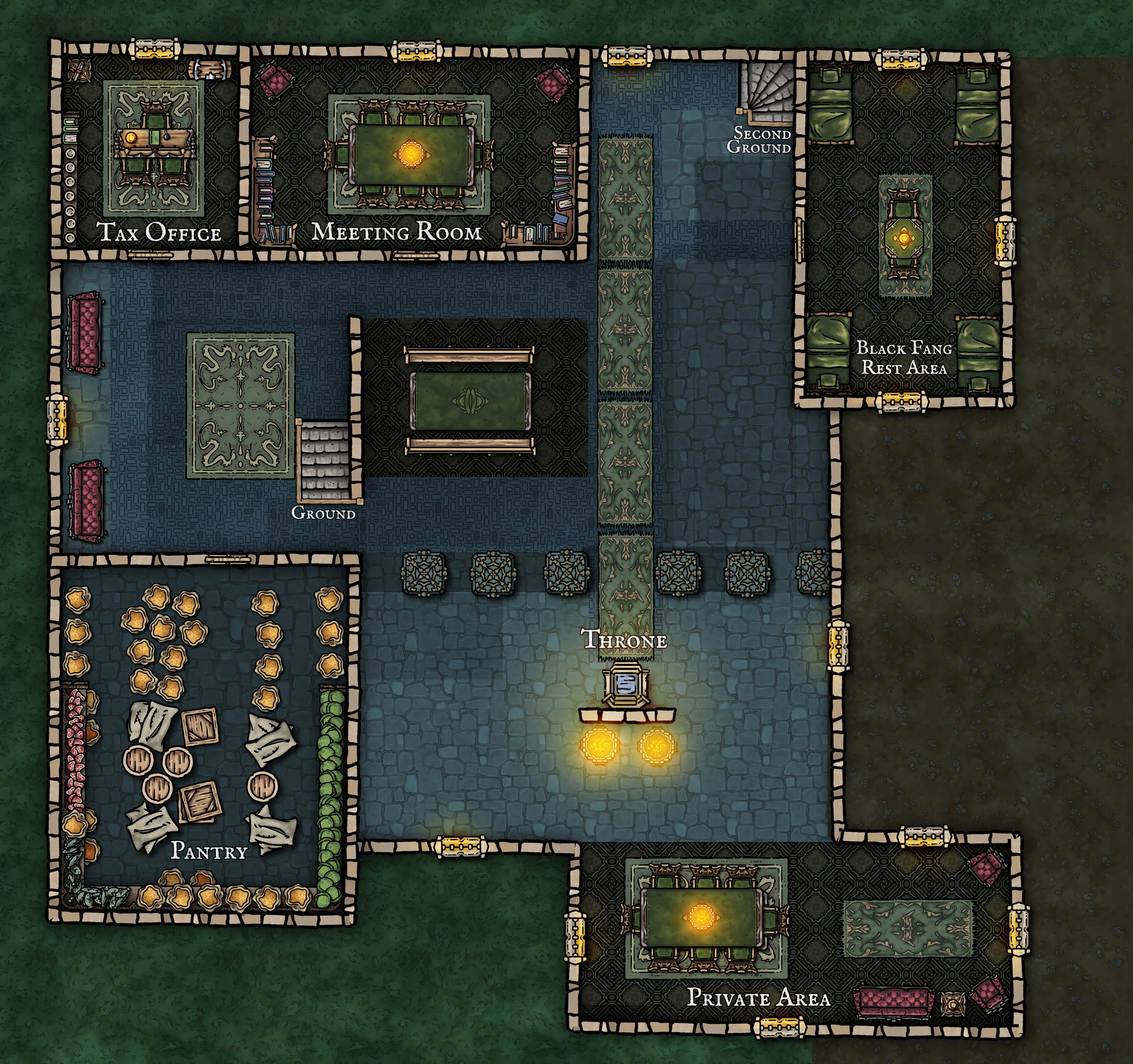 Castle Veil’s purpose is rooted in the circumstances of Mire Point’s creation: a rapidly expanding marshland capital that needed stability, order, and central authority in a region defined by danger, migration, and political fragmentation. Rather than a palatial symbol of luxury, Castle Veil was built to serve as the nerve centre of Clan Bogclutch’s government, military command, and civic administration. Every room and floor exists to fulfil a specific role in holding the city together.