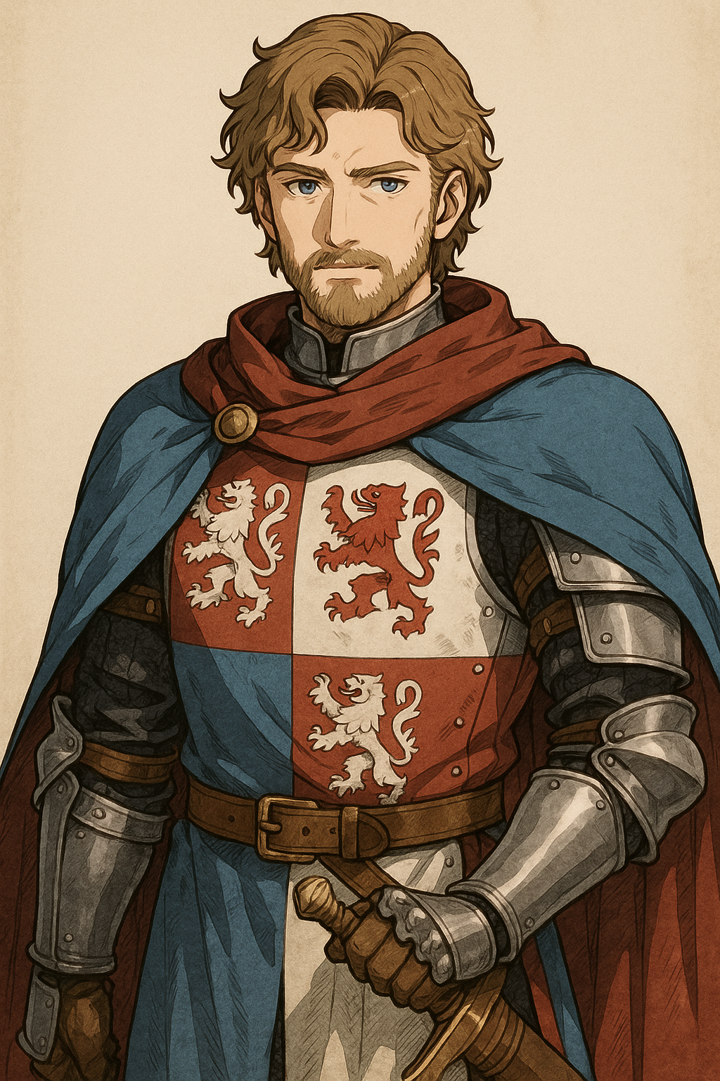 He wears a polished steel breastplate over layered cloth and leather garments, offering protection without sacrificing mobility. His surcoat is divided into light blue and red quadrants accented by white trim, the recognised colours of House Alderian and bears a stylised lion crest, signifying noble lineage and territorial authority.
