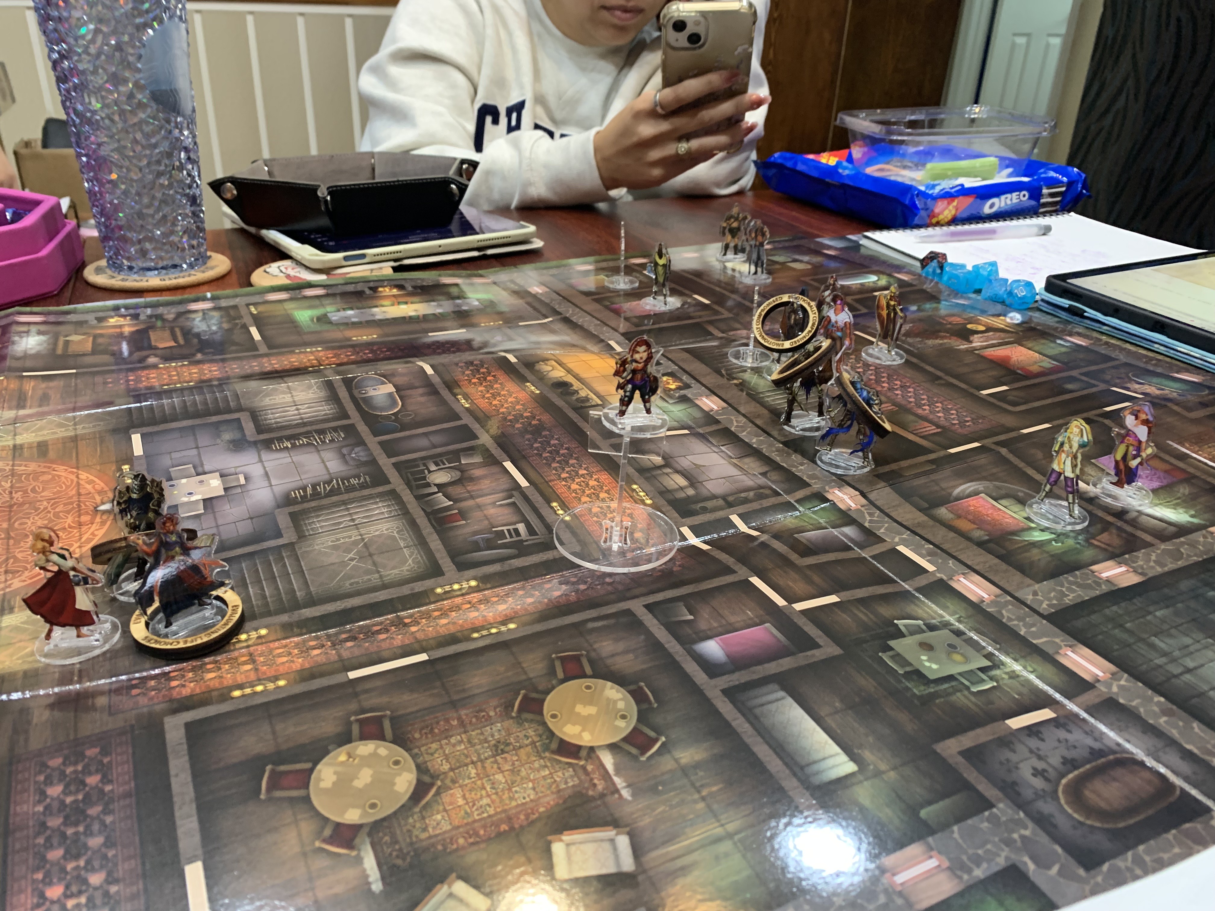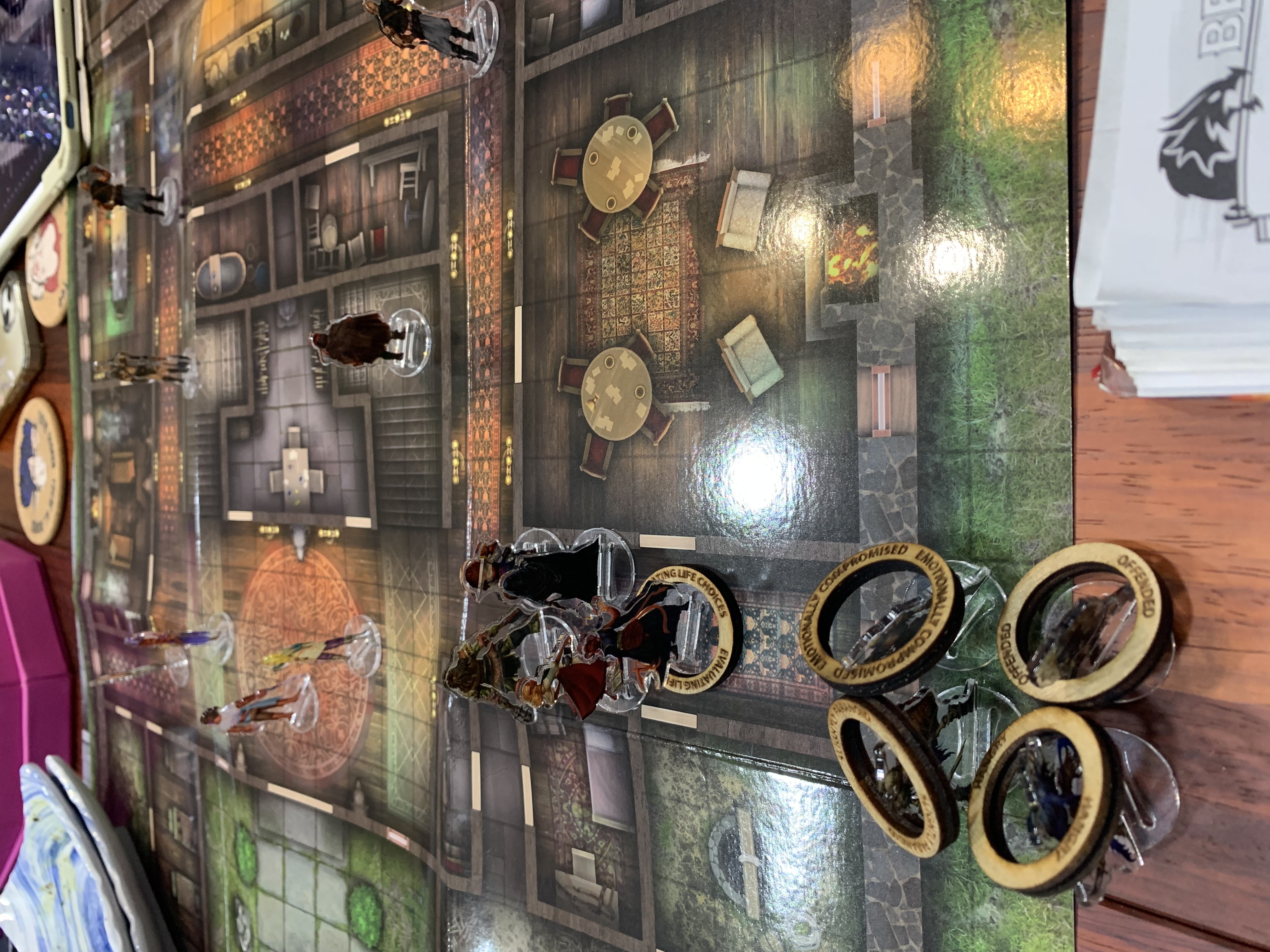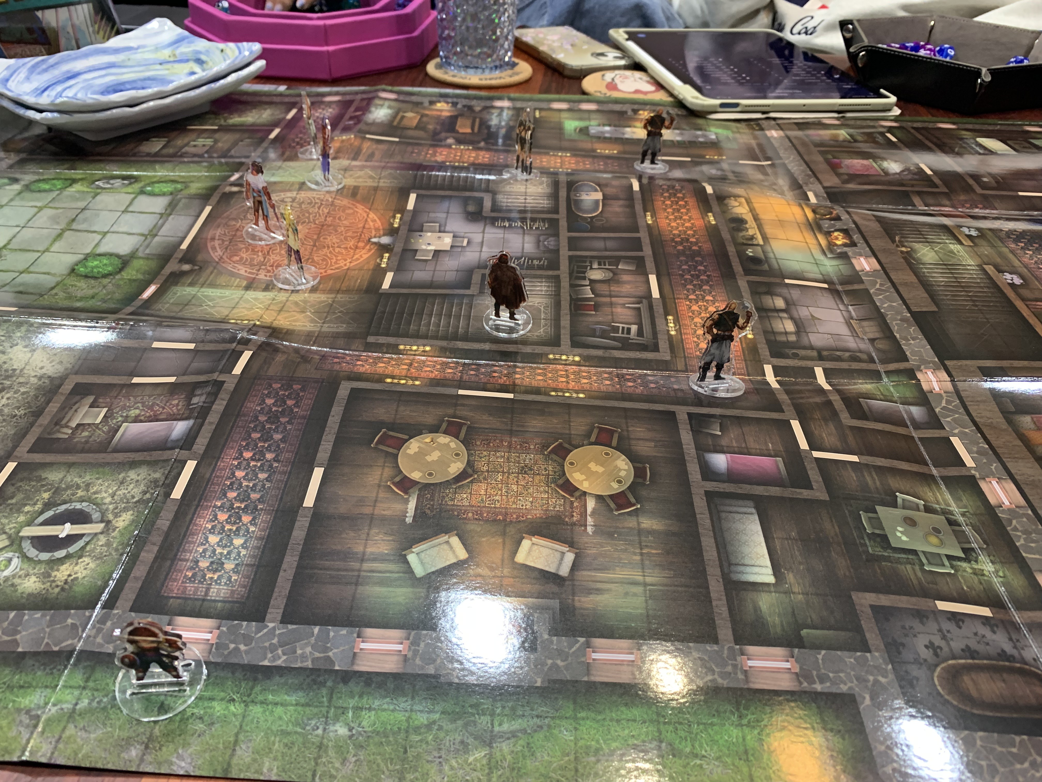 As the Sea Prince scout steps into the darkness, Nar and Karia quickly dispatch him, but the rest of the guards shout an alarm as the two forces join into battle. The party rushes into the foyer dodging arrows shot from hallways on either side of the stairs. Nar reacts and spider climbs along the walls returning arrows at the guard down the hallway. Meanwhile Jane and Karia rush the center raider while a scrawnier man dashes up the stairs and away from the battle.