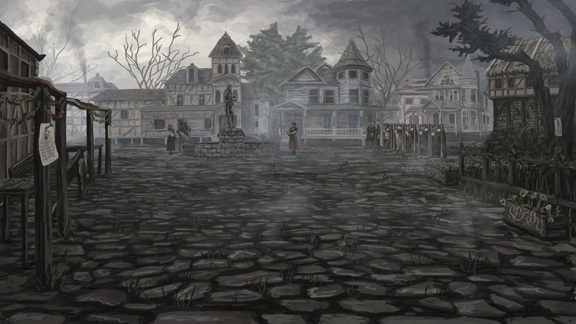 Citizens line the path as the parade heads toward the center of town, even Danika, Urwin, and their boys are among the crowd. As the horses pass, the townsfolk join the procession so that the entire town enters the square behind the party. The guards carry the effigy to the center of the square as the townsfolk encircle it.