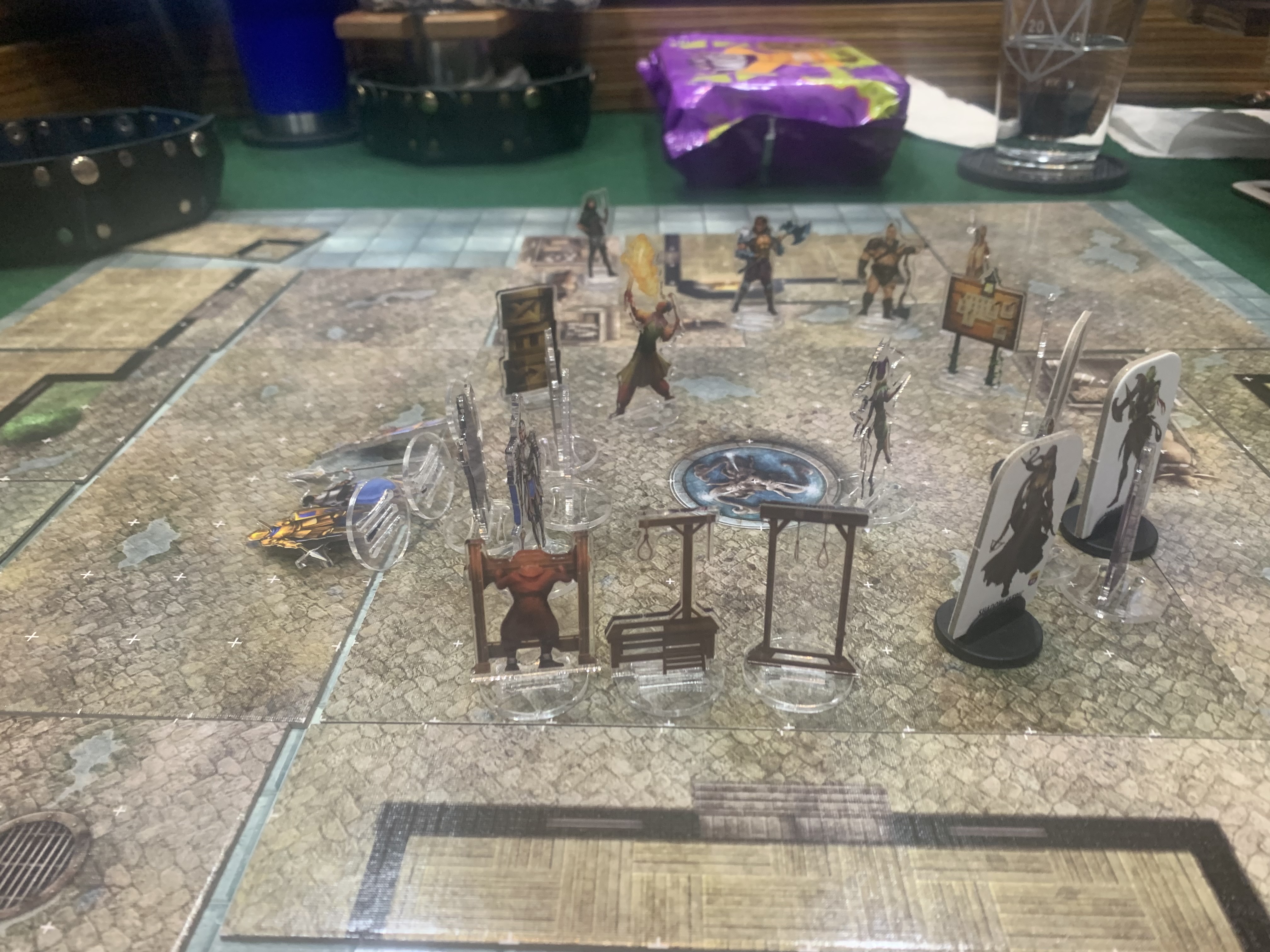 Throwing open the door, the party looks into a master bedroom with an obvious trap door in the ceiling. Pulling on its rope, the party ascends into a twenty foot square dusty room. Noticing a door, the party heads into the main storage area and follow a footpath to another door on the far side with a large skull carved into the door and a sign reading "All is not well". As they approach, they hear a young man's voice beyond so Nazgog slams open the door tripping a warding glyph that explodes in her face.