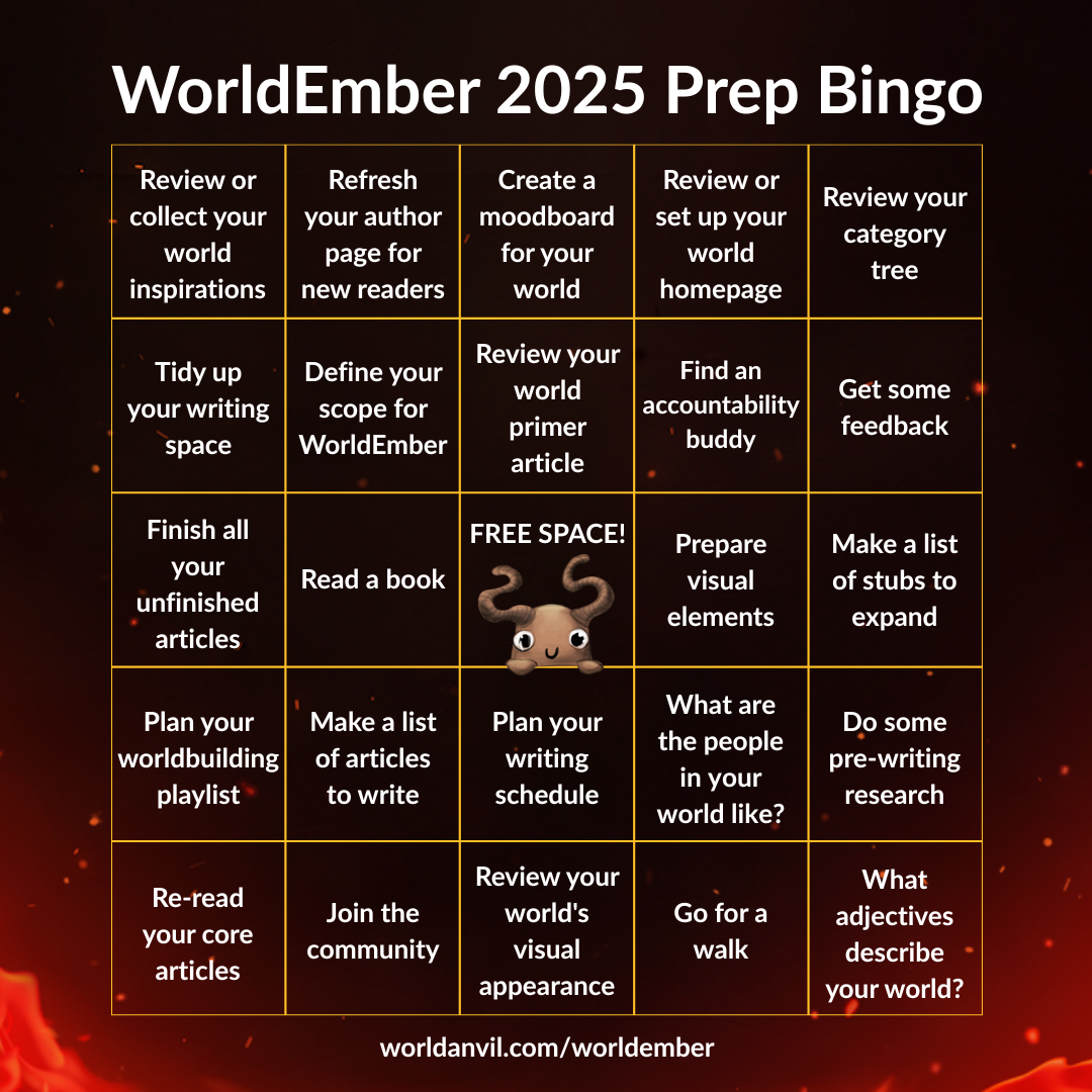 Have fun in your first WorldEmber!! Best luck with your goals, both in the Bingo prep and the event afterwards :)