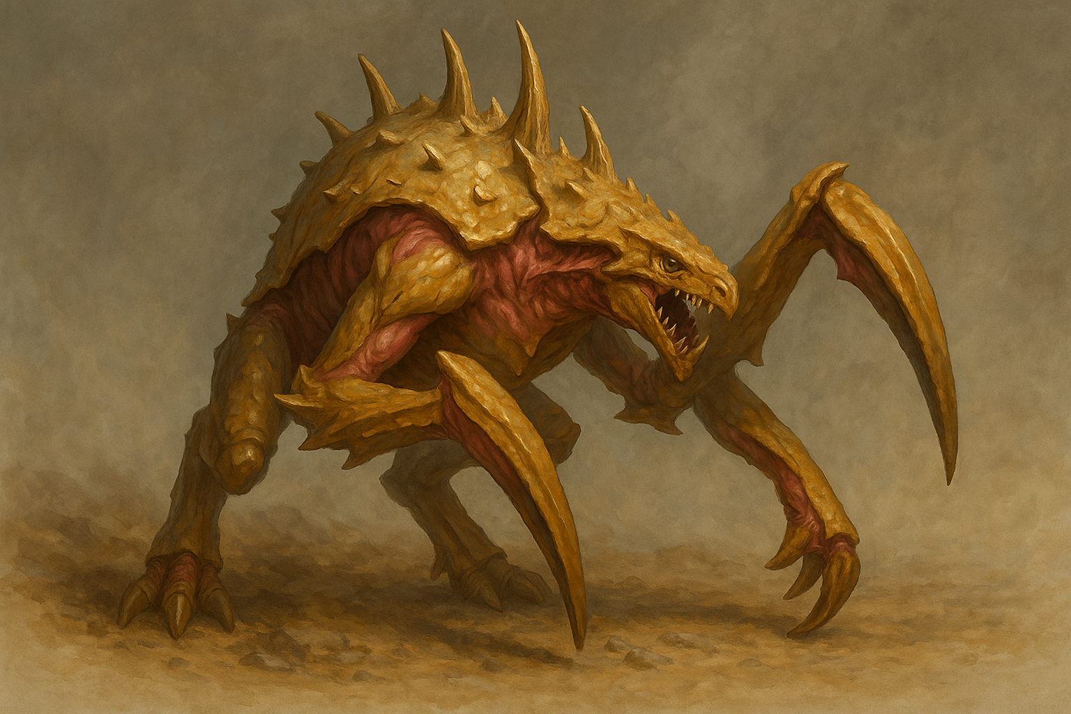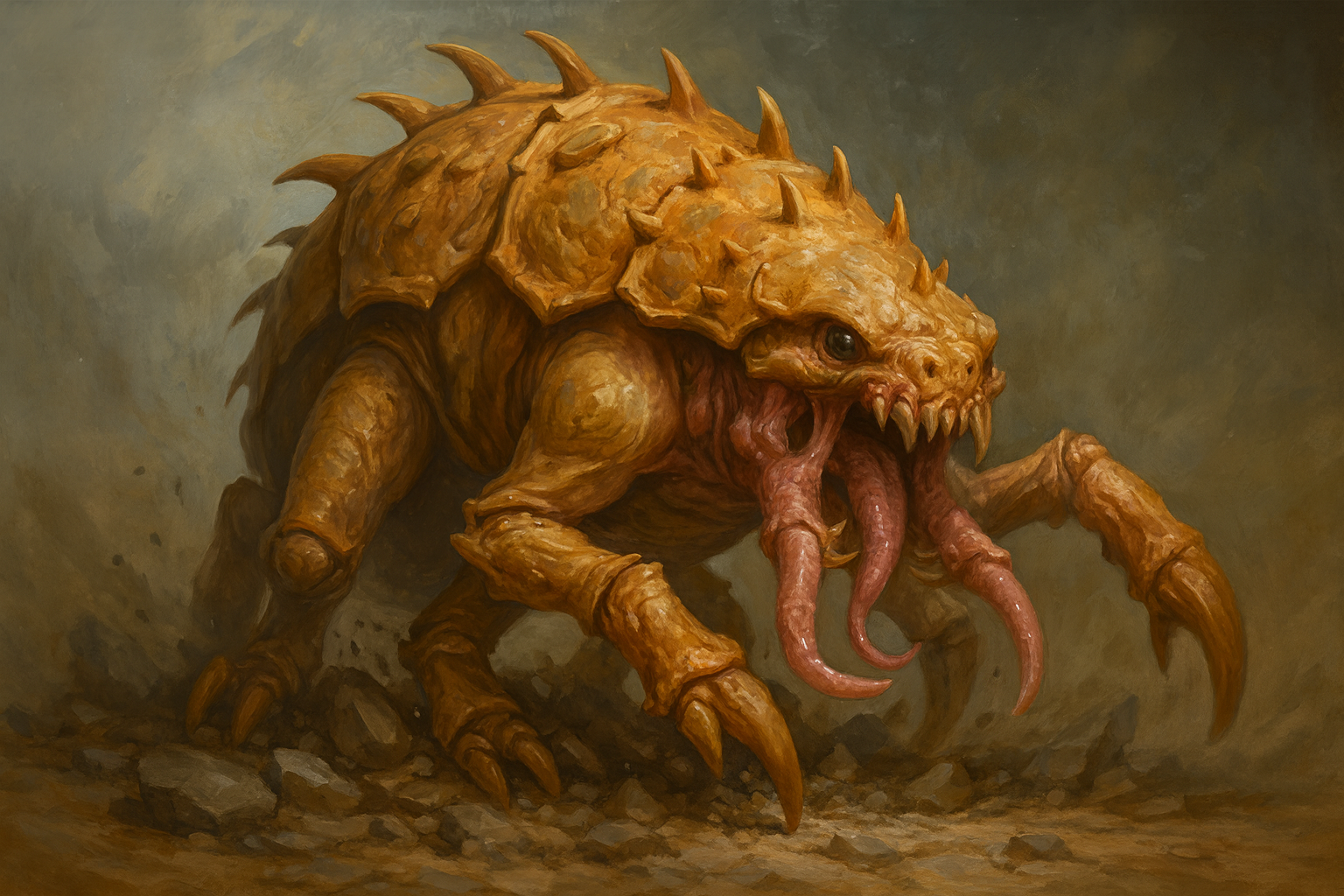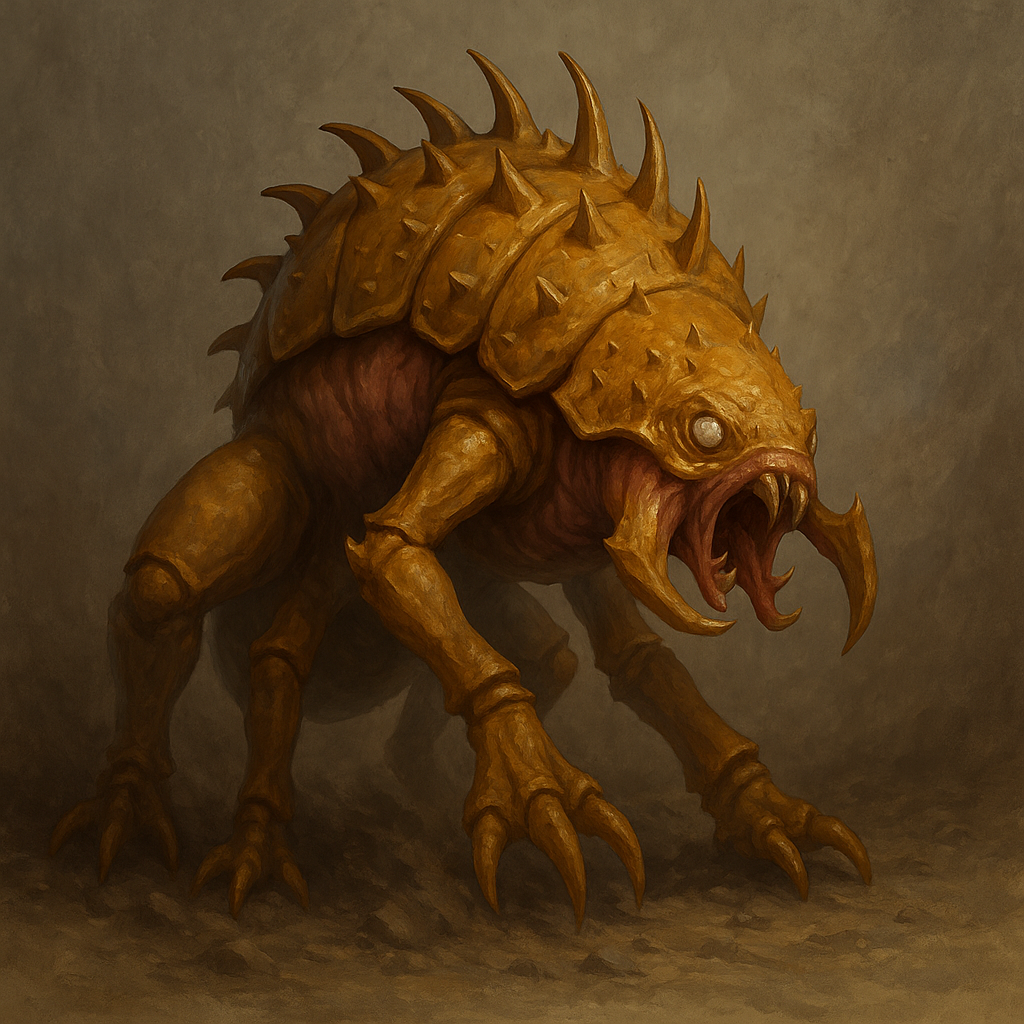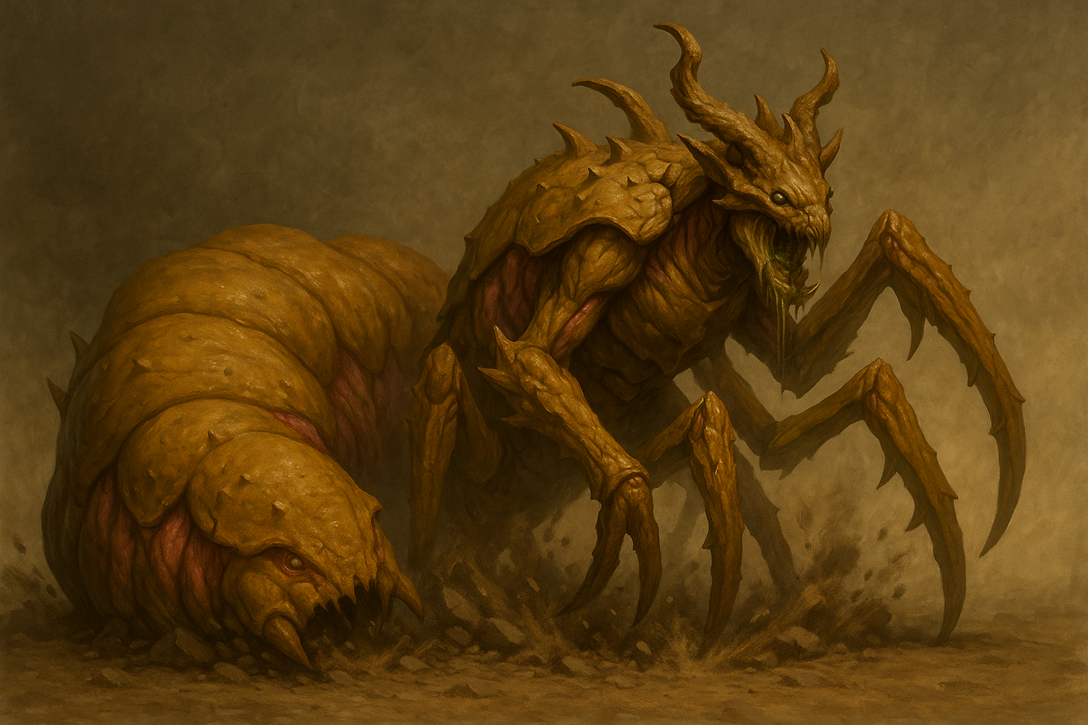 Where the drones scuttle, the burrowers thunder. Vast creatures with shovel-like claws, their bodies are living engines of excavation. When one erupts from beneath your feet, the ground heaves like water, and stone shatters as though it were soft clay. Their mandibles are slick with acid, their shells ridged with strength, and their patience endless. They do not pursue prey far; they simply wait, listening through the ground until the time comes to strike from below.