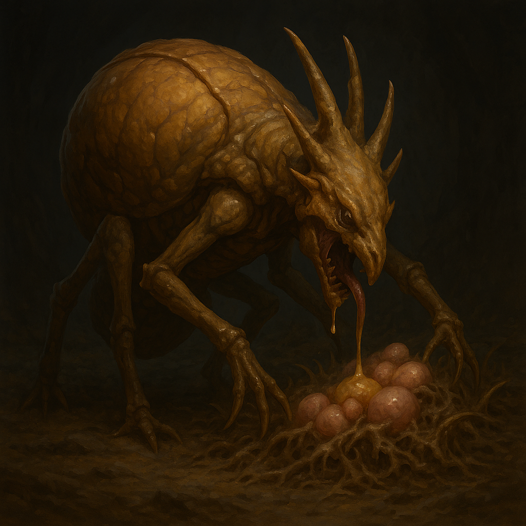 The broodtenders are perhaps the most disturbing to witness, for they are not warriors but nurses. Their swollen abdomens trail slime as they drag themselves between chambers, their small forebodies gnashing with rows of teeth, while delicate arms ferry lumps of flesh into larval pits. They gorge themselves on corpses, then dissolve what remains in bubbling acid, regurgitating it into the maws of the young. Harmless at a distance, yes — but intrude upon a nursery, and you will find their devotion no less deadly than a Ravager’s blade.