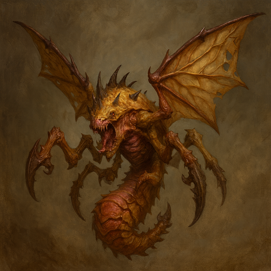 From the ceilings and chasms come the Skivers, their wings shrieking in a metallic hum that rattles bone. Though blind like their kin, they sense the world through the same subterranean rhythm — their tail pincers feel the faint reverberations of echoed footsteps and vibrations that travel through air and stone alike, allowing them to perceive movement even while aloft. Their middle limbs are grotesquely overgrown, snatching prey from ledges or holding them aloft as pincers at their tail snap shut. They are hunters of the high places, the hive’s eyes and ears in caverns too vast for drones or burrowers. One Skiver can harry a traveler for hours, but a swarm of them will strip a caravan bare before a scream can echo.
