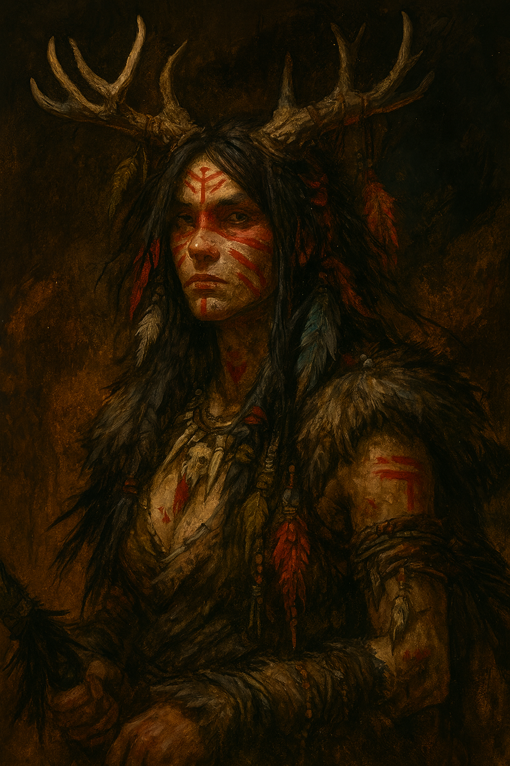 Shamans typically wear antlered or horned headpieces, cloaks hung with feathers, bones, and charms. Their skin is heavily covered in ritual scars and tattoos.