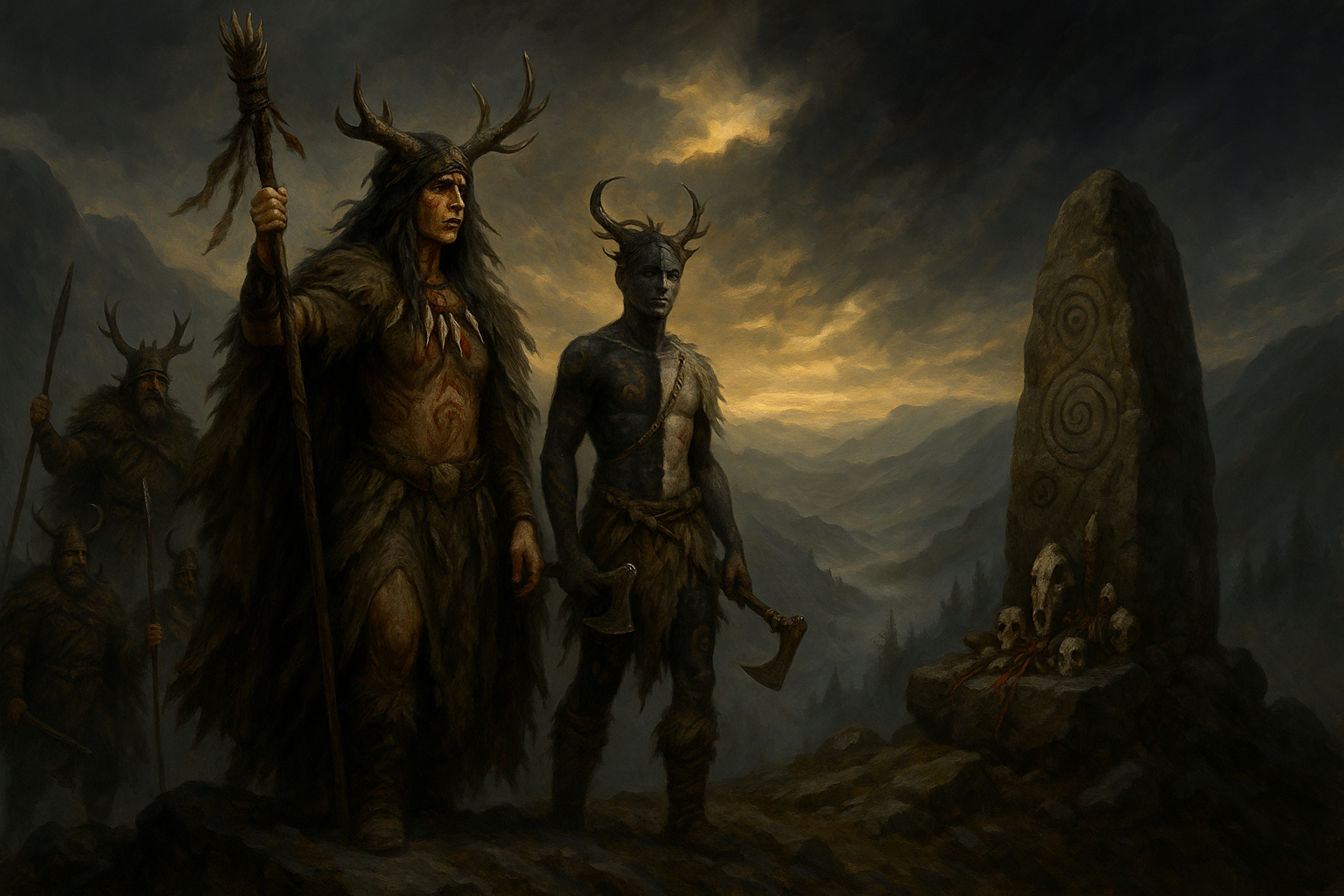 The Athrukar broadly believe in ancient Siar Animism, still practicing rituals and beliefs that have long since been forgotten by their Clansmen kin. They venerate the spirtis of river, tree and stone, conducting elaborate seasonal rites in sacred groves and at waystones dotted across the hills of Northern Siarland. Shamans serve as both spiritual and practical leaders of Athrukar tribes, often marked in ritualistic scars and tattoos.