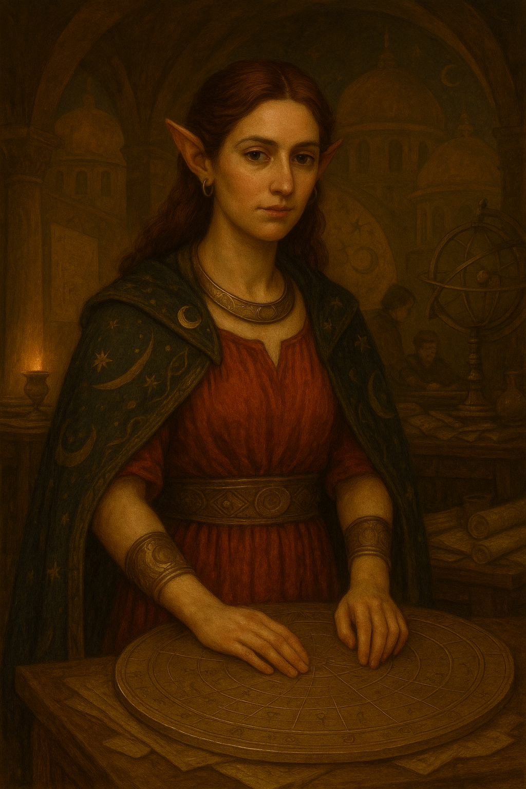 From an early age she demonstrated a keen interest and acuity in astronomy, surpassing her tutors in the mapping of the stars and the prediction of celestial movements. Though gifted, she found Lorinthan scholarship stifled by courtly patronage and factional rivalries. By her third century she headed North, drawn by the tales of Thaloris whose bronze domes crowned the northern Velvet Coast and who's great observatories were unrivalled the world over.