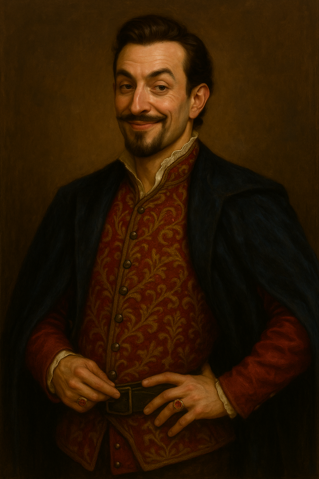 He favors brocade doublets and gaudy rings, with a pointed beard and perfumed silks that barely disguise the sweat of travel.