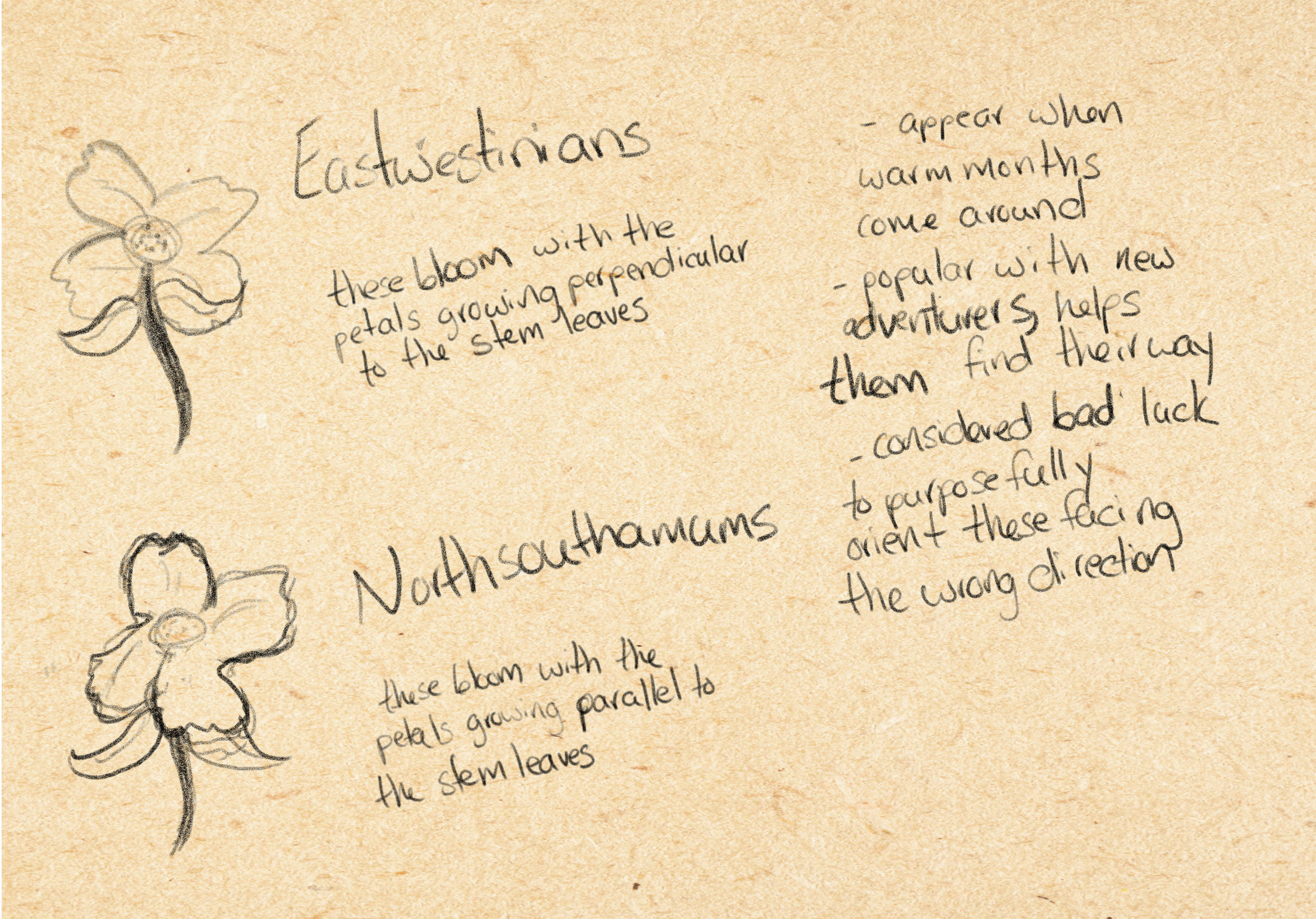 When traveling through lush green plains and/or forest, one can find their way by following the compassblooms. The leaves and petals of these flowers grow according to the cardinal directions. Aptly named Eastwestinians and Northsouthamums the petals grow perpendicular or parallel to their respective stem leaves.