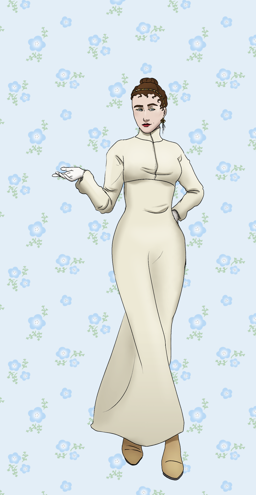 Clothes are always modest (covering 90% of her skin) and light in colour.