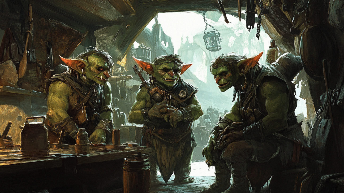 Goblins are small, typically standing 3 to 4 feet tall. They have flat faces, broad noses, pointed ears, and small, sharp teeth. Skin colors range from yellow-green to red-orange, depending on the subspecies.