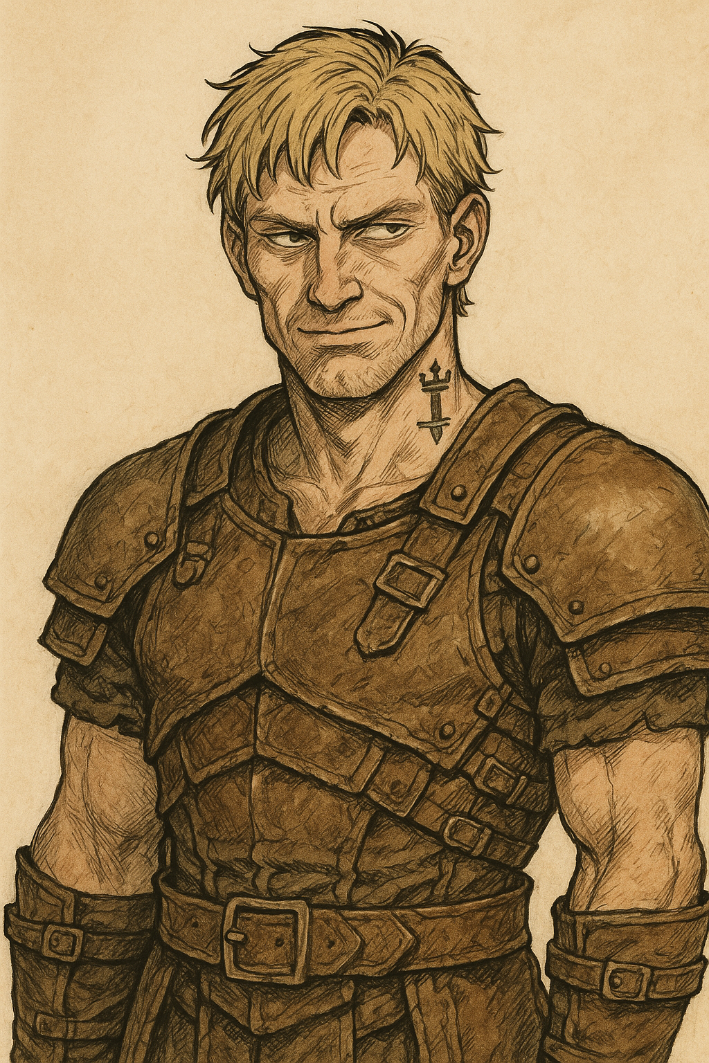 Seine abgenutzte Lederrüstung weist zahlreiche Gebrauchsspuren auf und unterstreicht sein raues, kampferfahrenes Erscheinungsbild. Sein Blick wirkt wachsam und misstrauisch.
