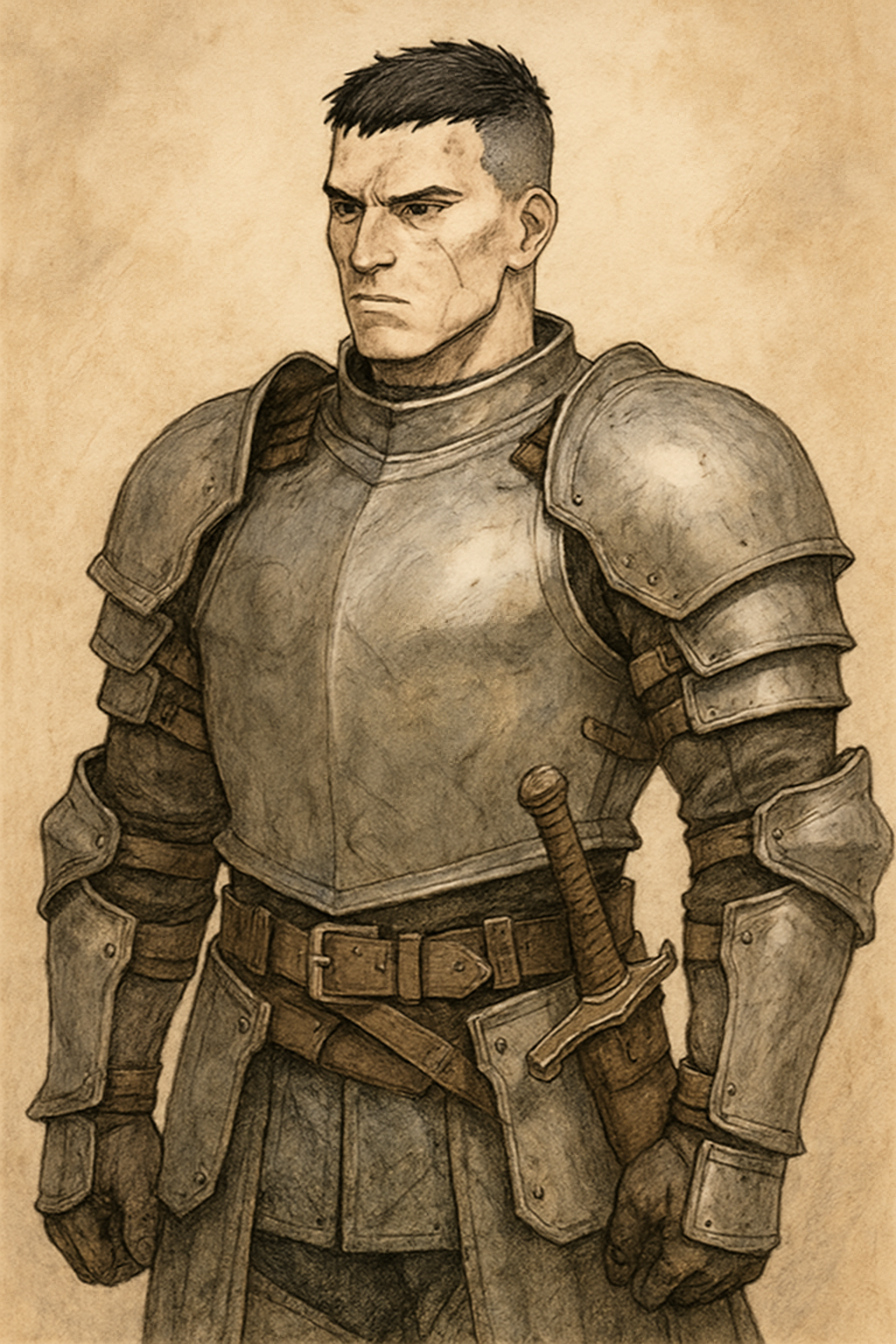 Leutnant Kael Dorn ist ein Mensch Anfang 30 mit kurz geschorenem, schwarzem Haar. Eine Narbe zieht sich über seine linke Wange und verleiht ihm ein markantes, ernsteres Erscheinungsbild.Er trägt eine Brustplatte, die sichtbare Spuren zahlreicher Kämpfe trägt – Kratzer, Dellen und Gebrauchsspuren lassen erkennen, dass sie oft im Einsatz war, aber stets instand gehalten wird. Ein Schwert hängt griffbereit an seiner Seite.
