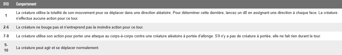 Une cible affectée ne peut pas utiliser de réaction et doit lancer 1d10 au début de chacun de ses tours pour déterminer comment elle se comporte pendant le tour. Une créature affectée peut faire un jet de sauvegarde de Sagesse à la fin de chacun de ses tours. En cas de succès, l'effet se termine pour elle.