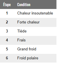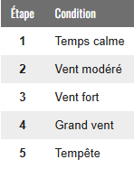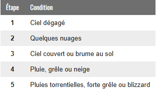 Quand vous modifiez les conditions météorologiques, cherchez les conditions actuelles dans les tables suivantes : vous pouvez les décaler d'un cran vers le haut ou le bas. Quand vous modifiez le vent, vous pouvez changer sa direction.