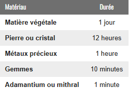 La durée du sort dépend du matériau choisi pour façonner l'objet. S'il est fait de plusieurs matières, c'est la durée la plus courte qui s'applique. Si vous utilisez les matériaux créés via ce sort comme composantes matérielles pour un autre sort, ce dernier échoue.
