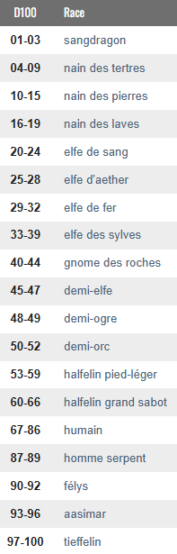 La magie façonne un nouveau corps pour accueillir l'âme, ce qui peut modifier la race de la créature. Le MJ lance 1d100 et consulte la table appropriée pour déterminer le nouveau corps de la créature réincarnée, ou en choisit un. La créature se souvient de son ancienne vie et de ses expériences passées. Elle conserve toutes ses capacités acquises, mais remplace sa race d'origine par la nouvelle et ajuste ses traits raciaux en conséquence.