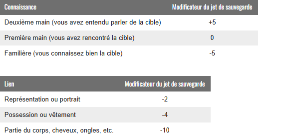 Vous voyez et entendez une créature donnée de votre choix, à condition qu'elle se trouve sur le même plan d'existence que vous. La cible doit effectuer un jet de sauvegarde de Sagesse, modifié par le degré de connaissance que vous avez d'elle et le type de lien physique que vous avez établi avec elle. Si la cible sait que vous lancez ce sort, elle peut rater volontairement son jet de sauvegarde si elle veut que vous l'observiez. Si la cible réussit son jet de sauvegarde, elle n'est pas affectée et vous ne pouvez plus utiliser ce sort sur elle pendant 24 heures.