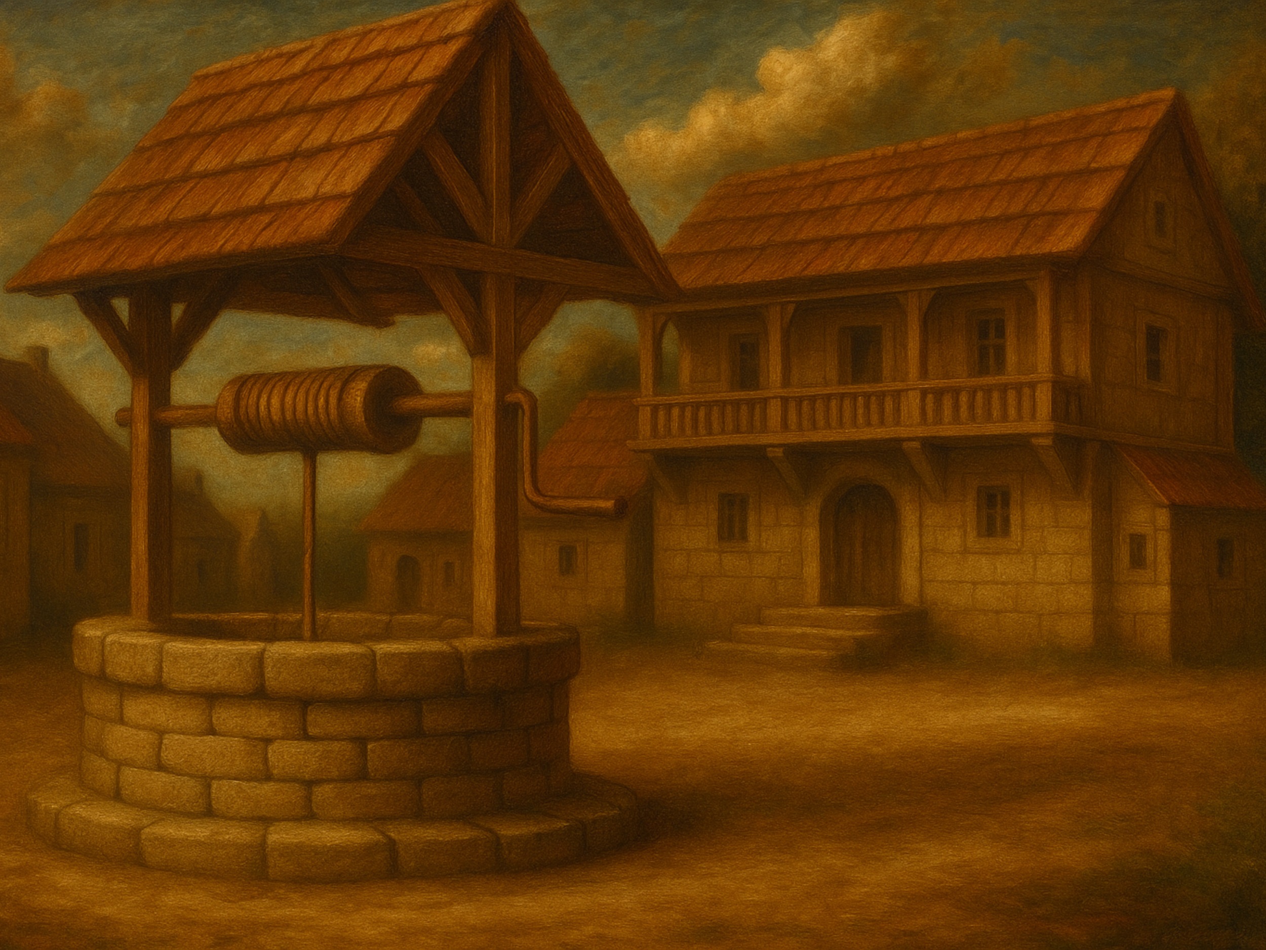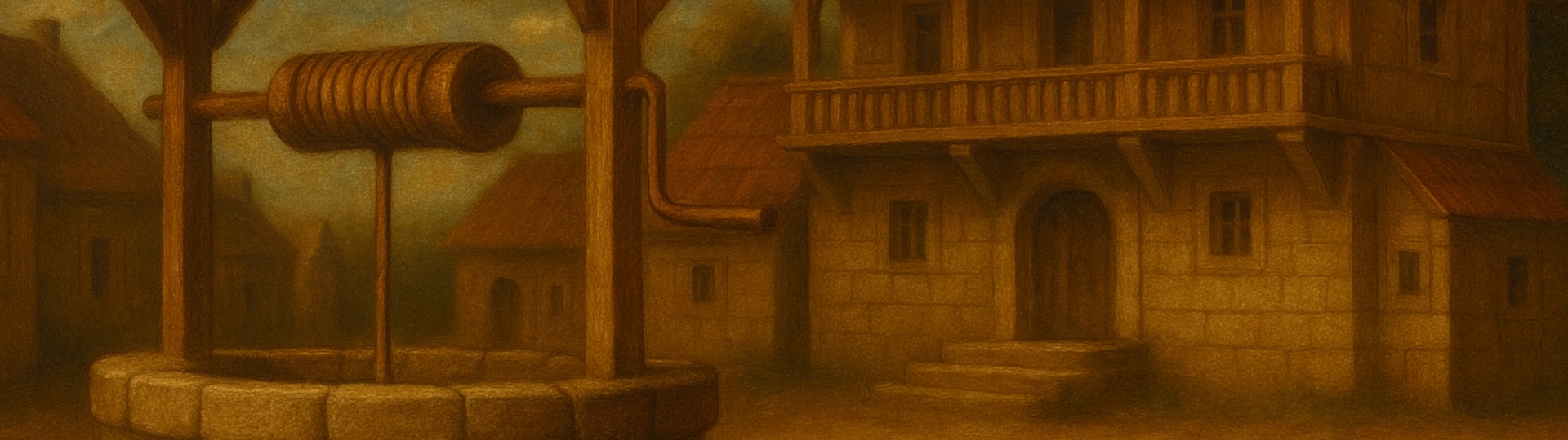 - Casa da Lei: É o coração cívico da vila, onde se registram os nascimentos, as dívidas, as mortes e os julgamentos. É lá que o Veche se reúne, que os juramentos são feitos e que as disputas são encerradas. No alto de sua fachada pende o sino da comunidade, usado para convocar os jureci quando necessário. Por dentro, o salão principal é simples, mas solene. As paredes estão cobertas por tabletes de cerâmica com os nomes dos que se foram. No centro há uma mesa de carvalho comprida marcada por anos de punhos impacientes. A única ornamentação digna de nota no térreo é uma escultura de um Nó da Cabra feito de madeira pendurada acima da mesa. No canto, uma porta leva para a chamada Sala das Dívidas, um aposento estreito no qual assuntos particulares podem ser discutidos durante as reuniões do Veche. No segundo andar ficam os arquivos, o depósito dos equipamentos cotidianos e dois cômodos que servem como dormitórios. Já no subsolo ficam armazenados os suprimentos da comunidade e duas celas onde ficam quem espera por julgamento. Pomir, o atual golovin, vive sozinho na construção desde sua eleição. Dizem que ele dorme em uma das celas estreita do subsolo, vigiando a entrada sem nunca dormir.