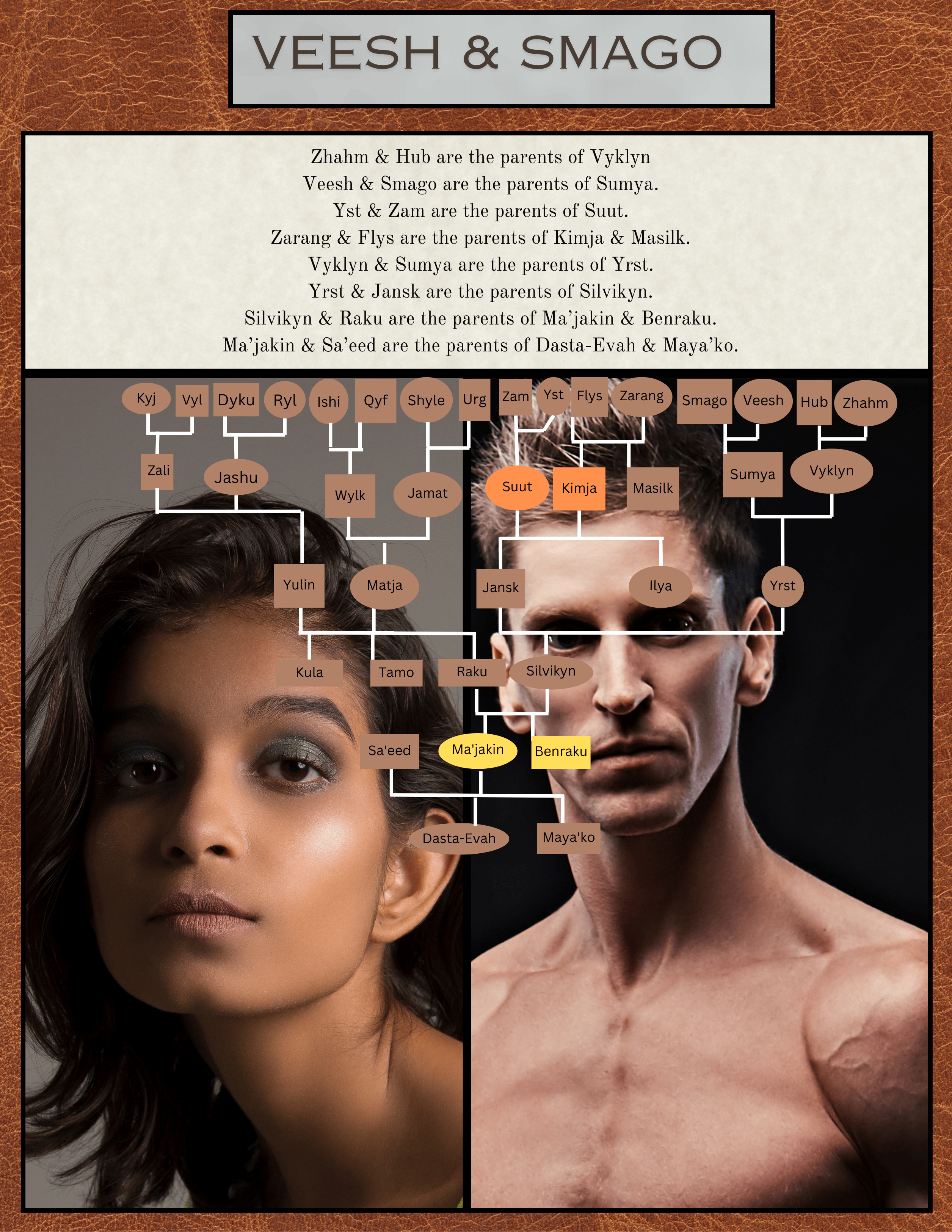 Sumya & Vyklyn are the main founders of The Consummation , though it was not organized as a religion or a pursuit until many generations later. Sumya came from a culture of extreme violence. Smago Smago & Veesh were his parents, Veesh was not from this planet. Smago sought to kill him and he to consume her, their inability to best each other led to their union and the wild and voracious Smago. Vyklyn came from a culture of emptiness. Her parents were Hub and Zhahm. After witnessing her mother being taken from her by strong men who sold her for her extreme beauty. Zhahm pursued the power to destroy, to be quicker, faster and more deadly than any other and at any cost. Hub had long abandoned all human pursuits and given himself to isolation and emptying himself. Zhahm met him on the mountain top and their consummation led to the birth of Vyklyn. Vyklyn was abandoned as a young woman and raised herself between the mountains of Jaune eating eggs from nests and hunting birds. She became obsessed with the power that she felt when she ate bigger and bigger birds, finally hunting a giant eagle for years before it left the mountain and headed towards the Galadite Forest near Kenax. As she hunted it and tried to find it in the forest, she encountered Sumya. Even in the fight that broke out between the two of them, there was the human contact that neither had enjoyed for years. Yrst Yrst was the result of that consummation and they abandoned her as well when she was a small girl, leaving her to fend for herself with not even a shared language being given to her by her parents. She only knew words, such as "eat, hide and kill" before her parents left her in the forest. The Consummation