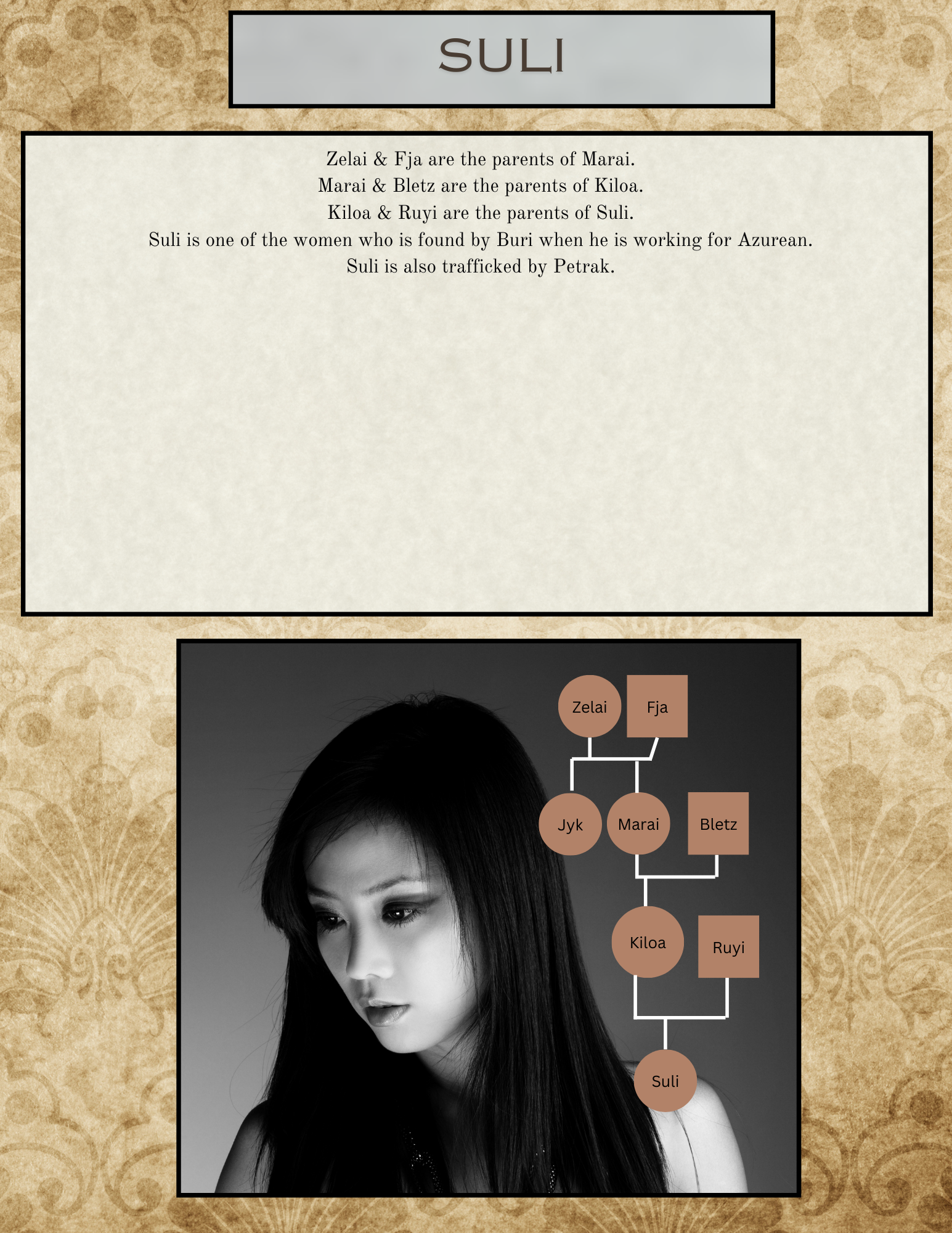 When her parents Kiloa & Ruyi use her as a decoy to trap passing marauders, on the way from their change of loyalty from Yulin to Rougeon, Suli takes offense and goes off on her own into the forest. She eventually is trapped in Pretobol's Forest by the Spider Peoples (relatives of Zim & Meeja) where her cousin is also trapped.