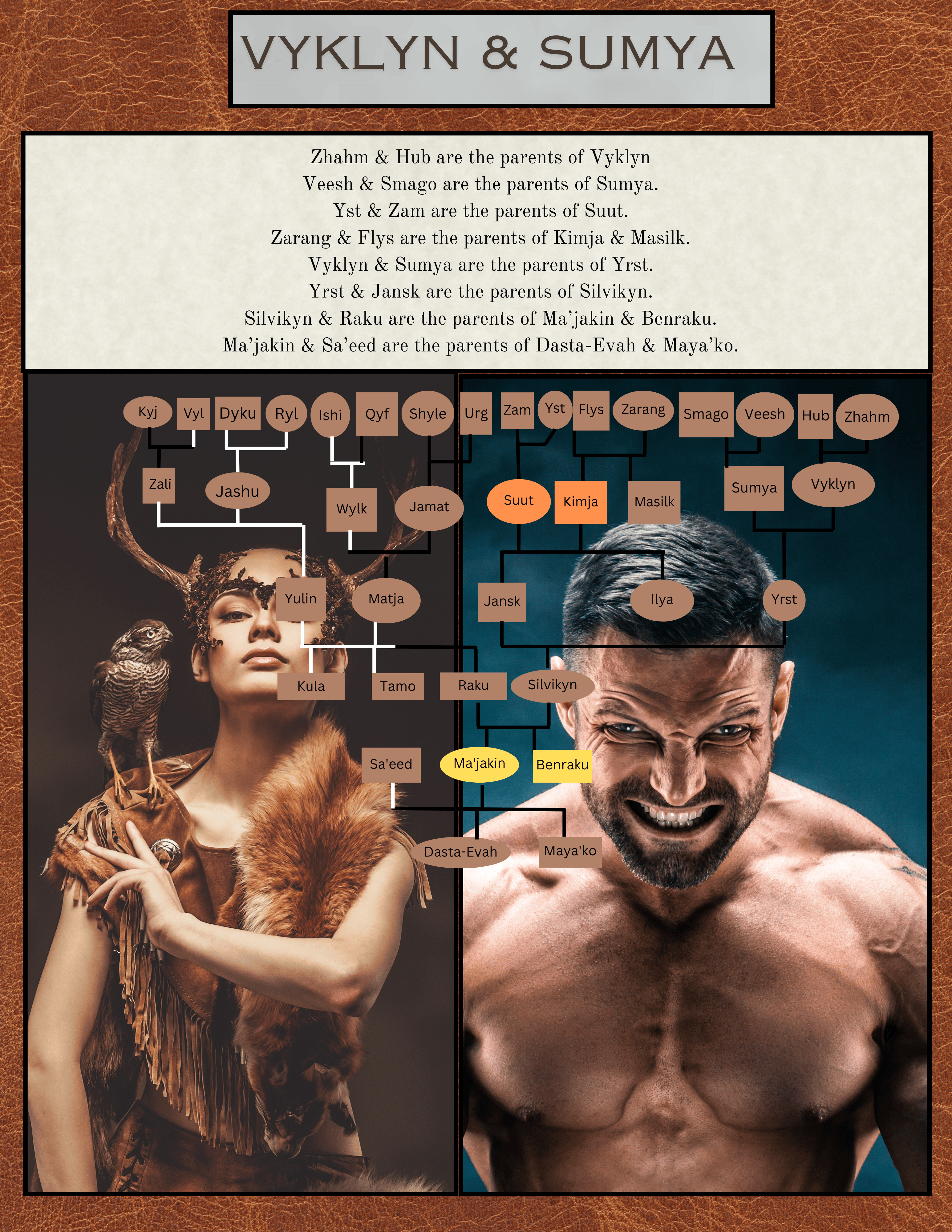 Zhahm After witnessing her mother Zyte being taken from her by strong men who sold her for her extreme beauty. Zhahm pursued the power to destroy, to be quicker, faster and more deadly than any other and at any cost. Hub had long abandoned all human pursuits and given himself to isolation and emptying himself.Zhahm met Hub on the mountain top and their consummation led to the birth of Vyklyn . Vyklyn was abandoned as a young woman and raised herself between the mountains of Jaune eating eggs from nests and hunting birds. She became obsessed with the power that she felt when she ate bigger and bigger birds, finally hunting a giant eagle for years before it left the mountain and headed towards the @Galadite Forest near @Kenax. As she hunted it and tried to find it in the forest, she encountered Sumya . Even in the fight that broke out between the two of them, there was the human contact that neither had enjoyed for years. Yrst was the result of that consummation and they abandoned her as well when she was a small girl, leaving her to fend for herself with not even a shared language being given to her by her parents. She only knew words, such as "eat, hide and kill" before her parents left her in the forest. The Consummation