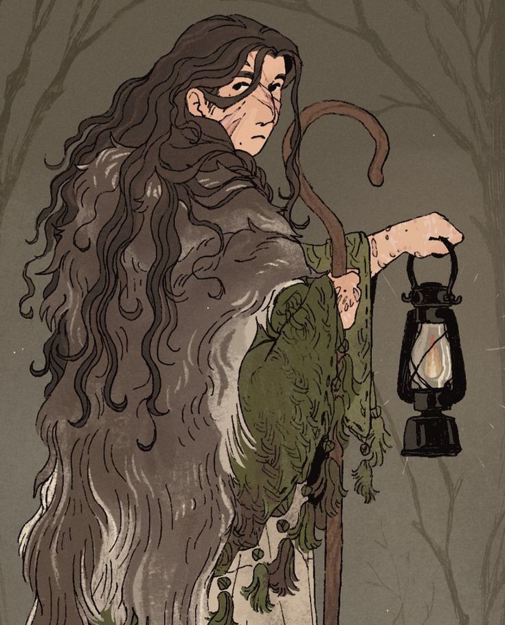 "Which of you is lost, hairless one?" a whisper of a voice echoed out of the deep green shadows of spruce. The shepherd whipped around holding his staff out between himself and the voice, seeing nothing but two dimly glowing orbs in the dark.