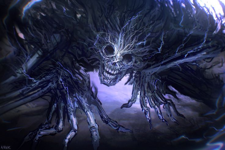 Scraping and groaning, like continental sheets of ice cracking and being pushed against eachother filled the underground catacombe. A figure stood, unmoved, singular red eye focused on a single point. The ritual had succeeded. Ash and vapor coalesced into a hulking, hunkering form. Pzioelectric flashes of pure bone-white backlit the skeletal frame of Inzjk, the Weyrdcaller.
