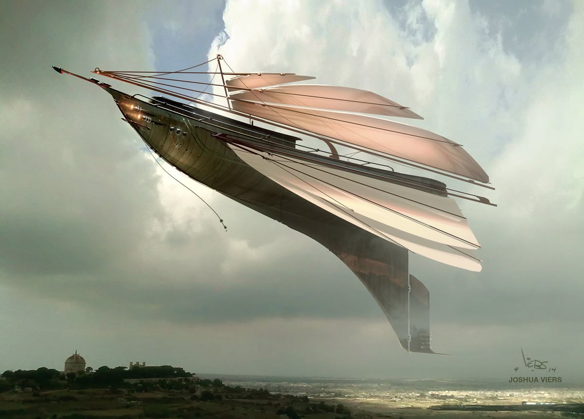 Image Credit: Joshua Veirs via Pinterest. This style of ship is what I imagine the Ociphen skyships to be similar to, but fully formed of glass, engraved and frosted to be extremely beautiful, but cruel at the same time. They are kept aloft by some sort of magic, and the sails and fabrics are for show, their propulsion comes from magic as well.