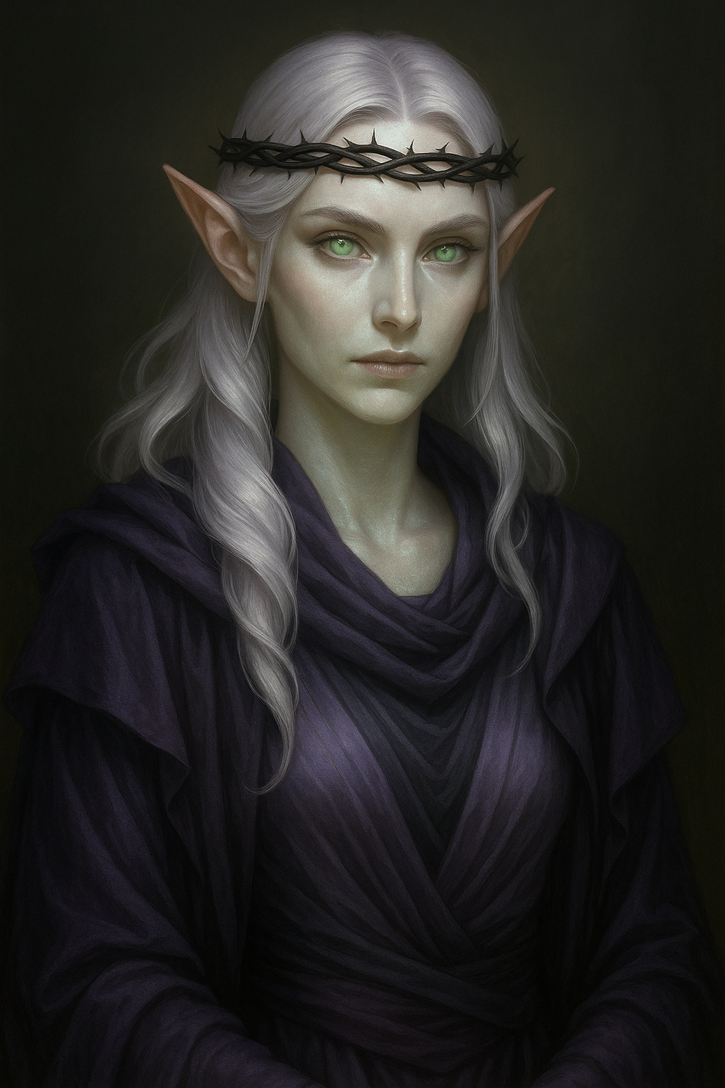 Ethereal and precise. Cyranel’s skin bears a faint opalescent shimmer, her hair silver-white with a soft lavender sheen, and her eyes a sharp pale green that glow faintly when she is angry or deep in thought. She dresses in layered silks—always violet or shadow-grey—and wears no crown but a circlet of woven black thorns, the symbol of her marriage to the Vipère line.