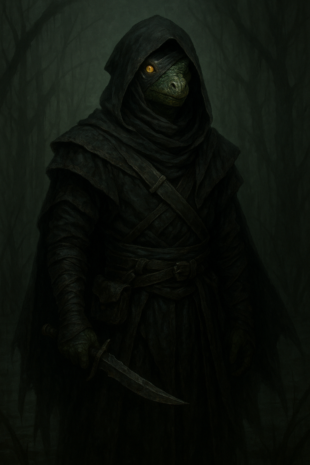 He escaped his chains by slitting his master’s throat and vanished into the swamps, where Sskarl found him. Since then, Hassith has been the Dominion’s shadow: hunting deserters, silencing traitors, and enforcing the Mire-Edicts.