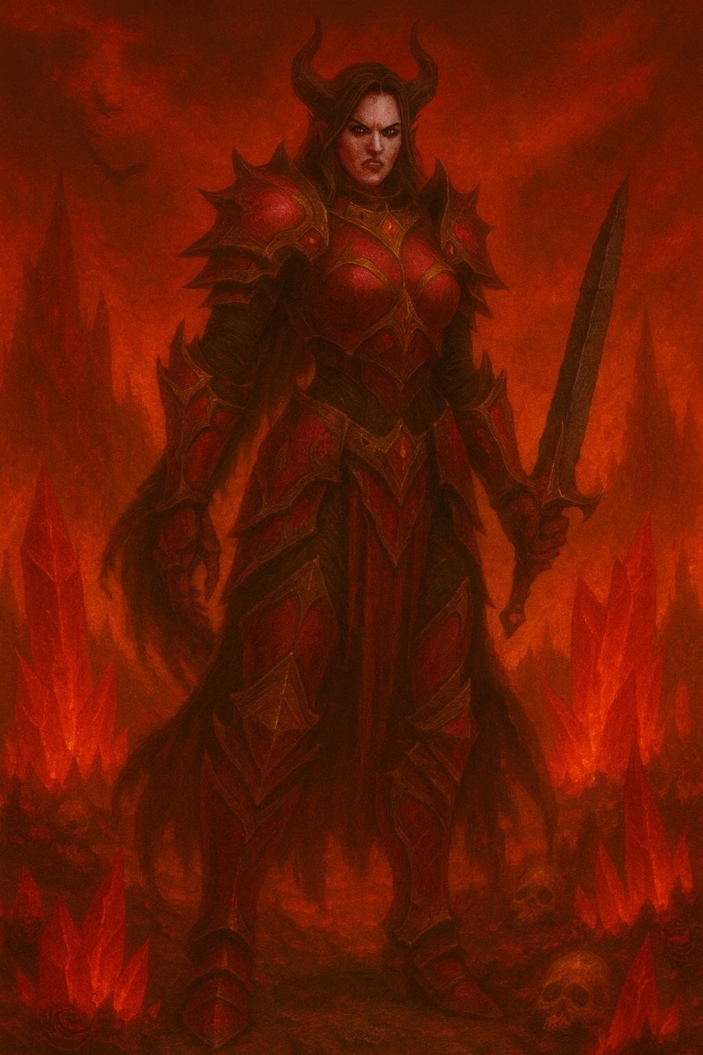 Kaelira was taken in chains to the Wastes of Flesh, a ritual site where bones and crimson crystals bled from the ground. There, she was forced into combat against horrors stitched from corpses and sinew. Dozens of prisoners died screaming, but Kaelira thrived—her rage turned the trial into carnage. At the climax, she fell upon her knees not in defeat, but in defiance, screaming: "If there is a god of blood and war—let him feed me more to kill!" Urmbrik answered. Her flesh twisted, her heart beat with molten rage, and her blood ran black with his power. Her armor fused to her body, her sword became a shard of bone and iron, and she rose as the Bloodbound—Urmbrik’s chosen Champion. Now – Servant of Urmbrik and the God Hands Kaelira Veythar marches at the head of Urmbrik’s legions in the Realms of Flesh and Bone. She is not only a warrior, but a banner—her presence causes barbarian tribes, pit fiends, and Urmbrik-spawn to rally as one. Her duties include: Leading the Blood Trials: overseeing mortal aspirants who wish to join Urmbrik’s horde. Few survive. The Butcher of Sanctuaries: desecrating temples of other gods, impaling priests upon crimson crystals. The Hand’s War Herald: Kaelira’s warcries are said to echo across planes, calling Urmbrik’s demons to battle. In the God Hands’ hierarchy, she embodies the face of endless rage. Where Geardaz deceives and Zonid manipulates, Kaelira annihilates. Her vow is simple, whispered in every conquest: "Flesh is weak. Rage is truth. In Urmbrik’s name, I will drown the world in red."