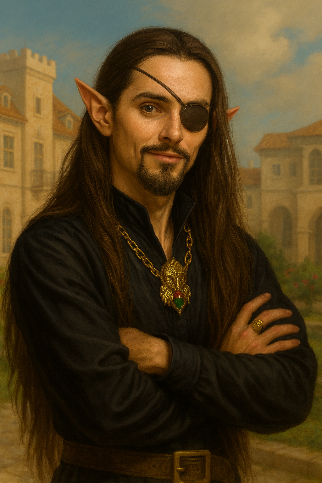 Tall and pale, with faintly pointed ears and silver eyes like mercury. His black hair, streaked with ash-grey, is always immaculately combed. He dresses in black silk trimmed with gold, perfumed with alchemical oil that masks the scent of poison. - Motto: “A viper smiles before it strikes.”