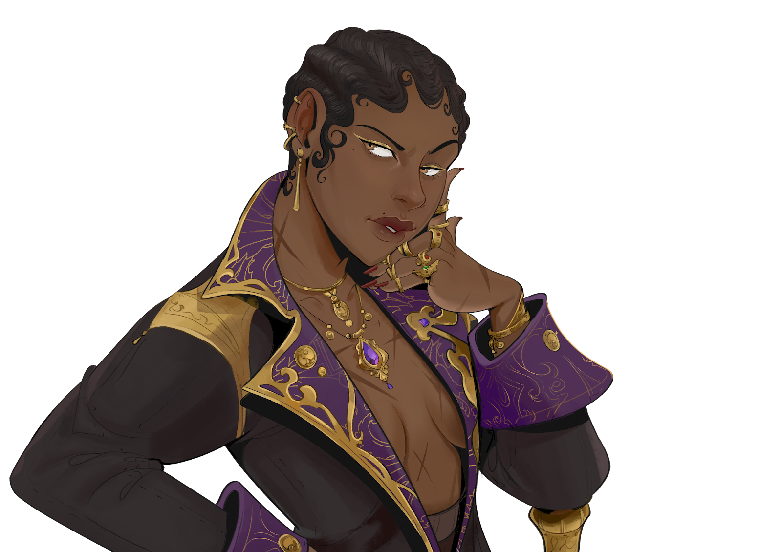 Aurum is confident and cunning -- and not at all interested in hiding it from anyone who speaks to them. They draw out their words and lace them with double meaning, taking as much space as possible both with their gestures and their sheer presence. They have an exaggerated, cocky way of moving their body when they talk, and a certain performativity to all they do, but that shiny veneer is replaced with cold, hard calculation and short, cutting sentences when talking business.