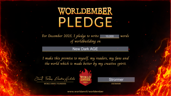 This has certainly been one hell of a year. The challenges I've been facing, which are far from resolved today, are perhaps the greatest I've encountered to date. I'd love to be positive, but I'm not sure I have that much hope in me these days. That said, one thing I've been told is very important is to make plans and set goals even if in the moment they seem unachievable if for no better reason than to give yourself something to keep striving for. Well, here I go. I'm pledging to write 10k words in December for New Dark AGE. I'd originally planned to do a lot of worldbuilding for NDA back at the beginning of this year with aims to get the first bits into production for release next year. I've done almost none of it. So here's me saying I'm going to get a job, I'm not going to lose my home, and I am going to have the time and drive to do it all next month.