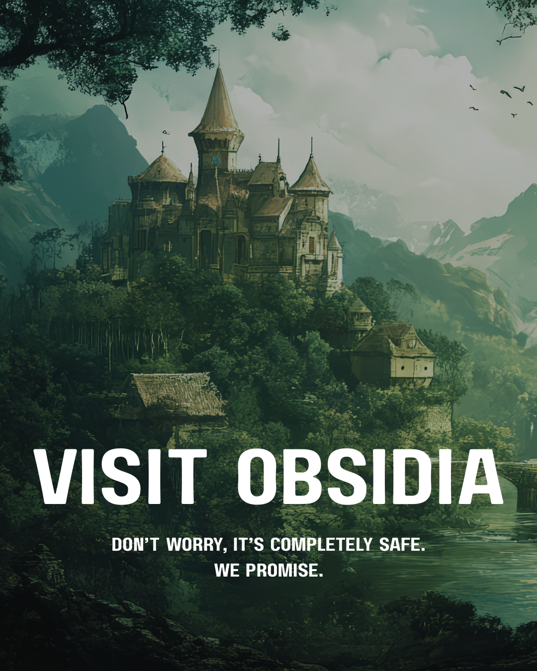 (Visit Obsidia poster. Text reads: "Visit Obsidia. Don't worry, it's completely safe. We promise".
