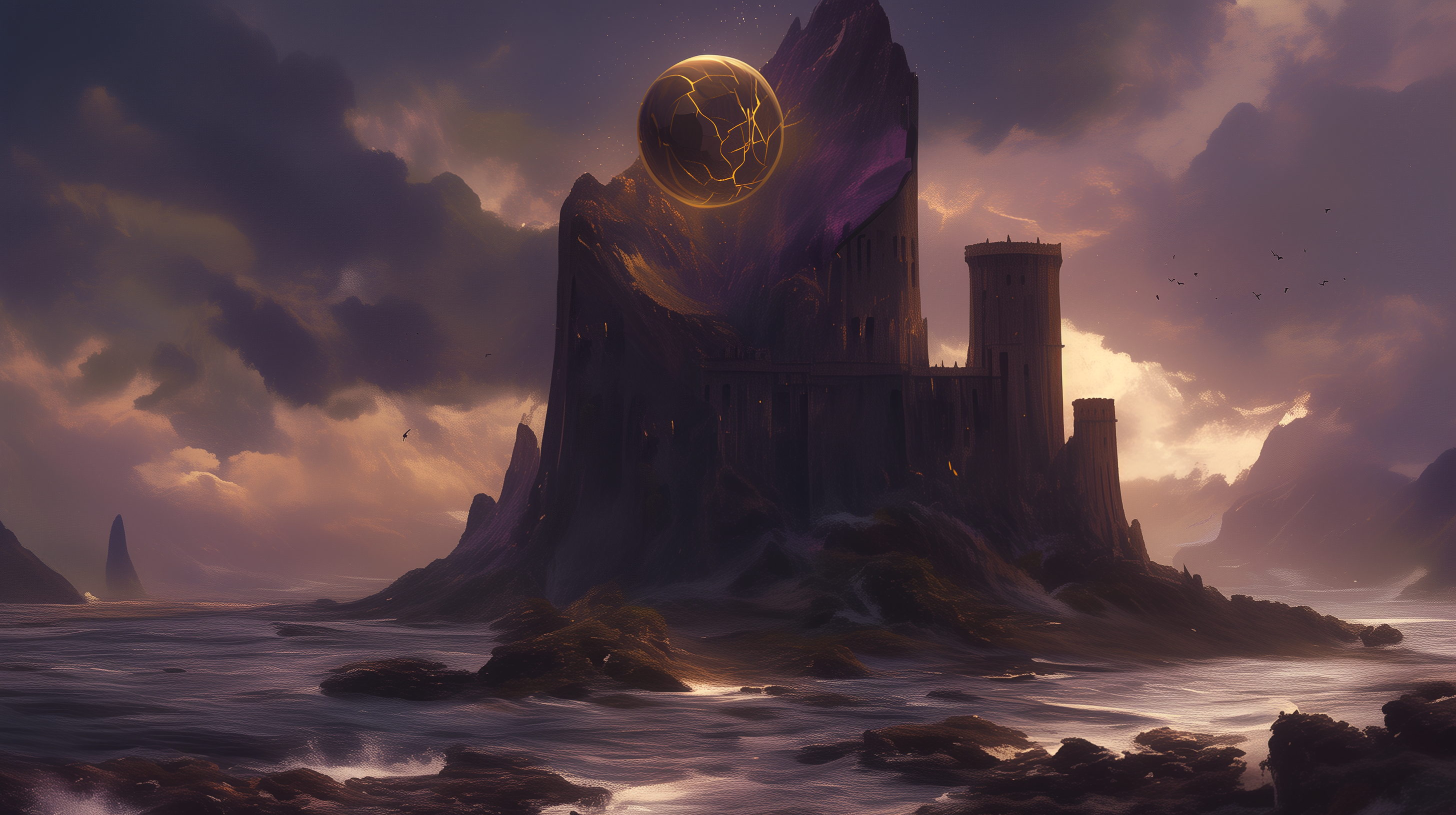 From what would be the center of the island, in the middle of the fort, rises a massive, partially collapsed tower, its upper reaches shattered and hollowed by some long-passed calamity. Above it floats a vast orb of black energy, streaked with veins of dull gold and cracked across its surface like fractured glass that pulses faintly like slow heartbeats. The cracks emit a dim, molten glow that pulses slowly, casting an uneven glow that dances like dying embers over the shattered tower below. As the island fully comes into view, you begin to notice lights and tall plumes of smoke start appearing on the island's shore and among the structures surrounding the fort.