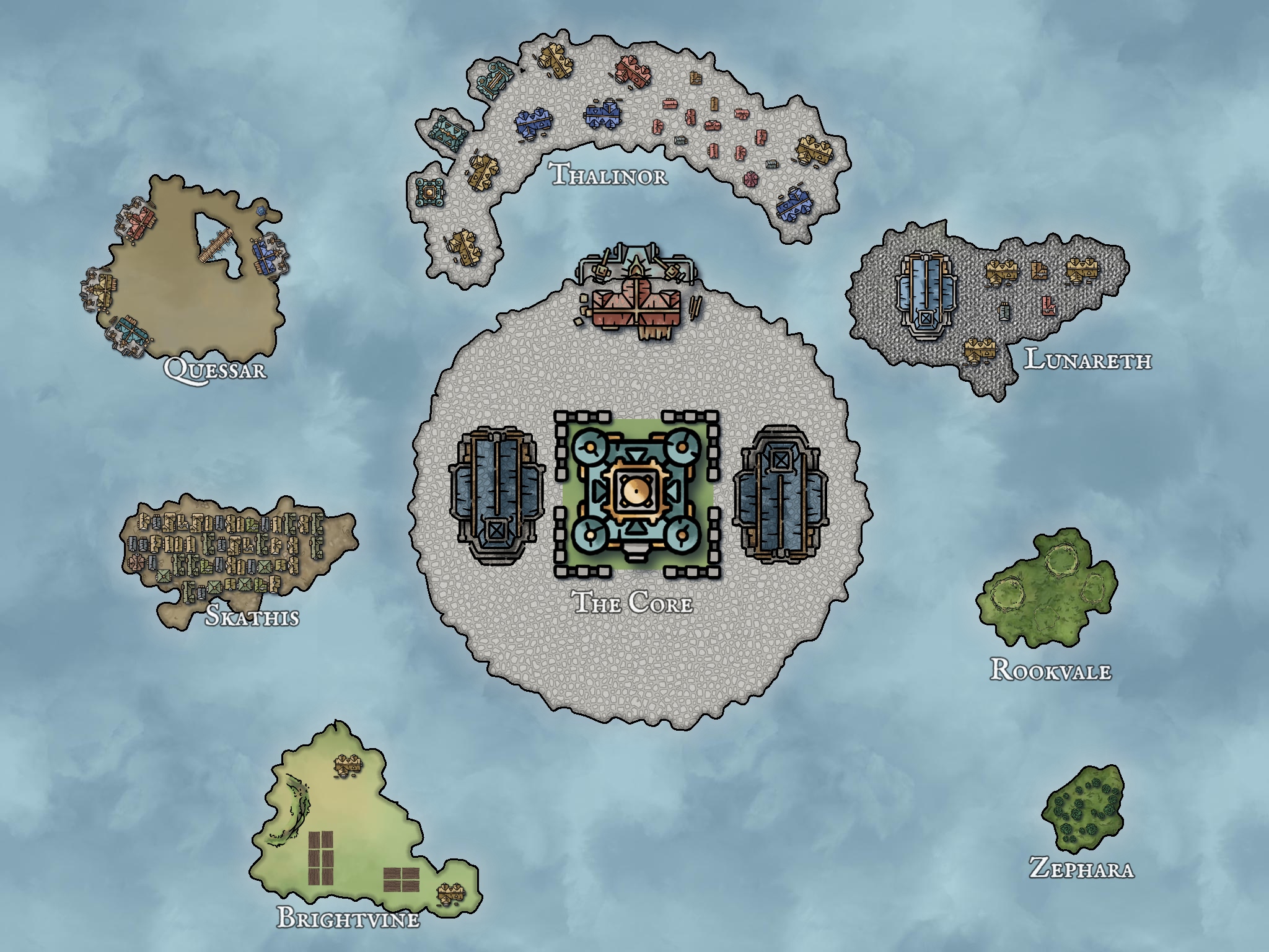 The largest of the outer islands, Thalinor is a bustling residential district filled with shops, taverns, and markets. Its lively atmosphere makes it the social heart of the outer islands, a place where citizens gather to eat, drink, and trade.