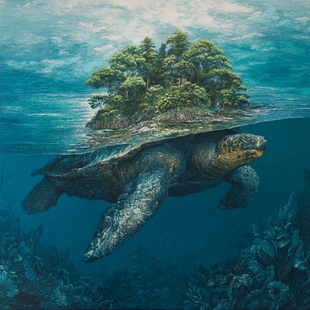 bleibt die "Schildkröte" immer halb unter Wasser, damit die Pflanzenwelt auf ihrem Panzer nicht zerstört wird, oder ist diese nur eine magische Illusion?