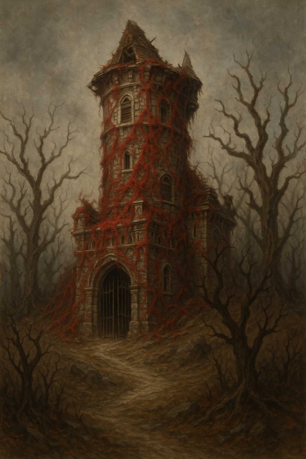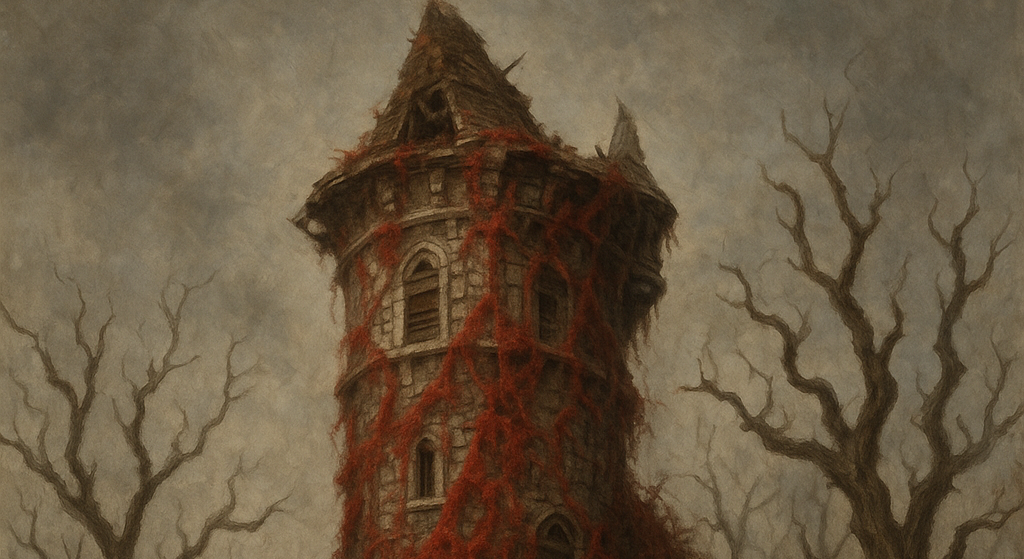 Over the crest of the hill is a dilapidated towercovered in blood-red vines, surrounded by dead pines appearing to rise like hollow clawing sentries. The masonry of the tower is remarkably ornate but has suffered immensely over time. Many of the windows are boarded up, and the roof seems to have fallen in, but the iron gate permitting entrance swings ajar.