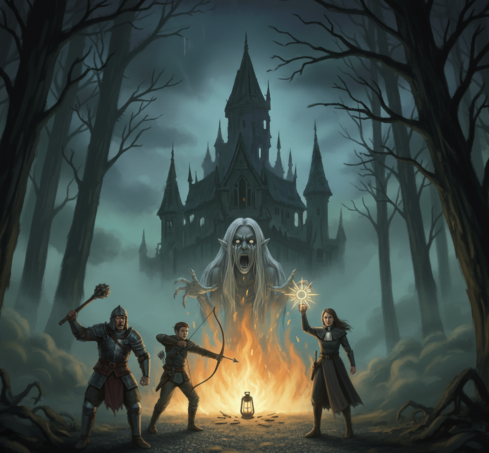 The banshee hovered at the edge of the flames, her face twisting. For one fleeting, heartbreaking instant, the monstrous mask of rage dissolved. The party saw not a monster, but the face of a young elf-woman, her eyes wide with the terror of her own death, her mouth open in a plea that had never been answered.