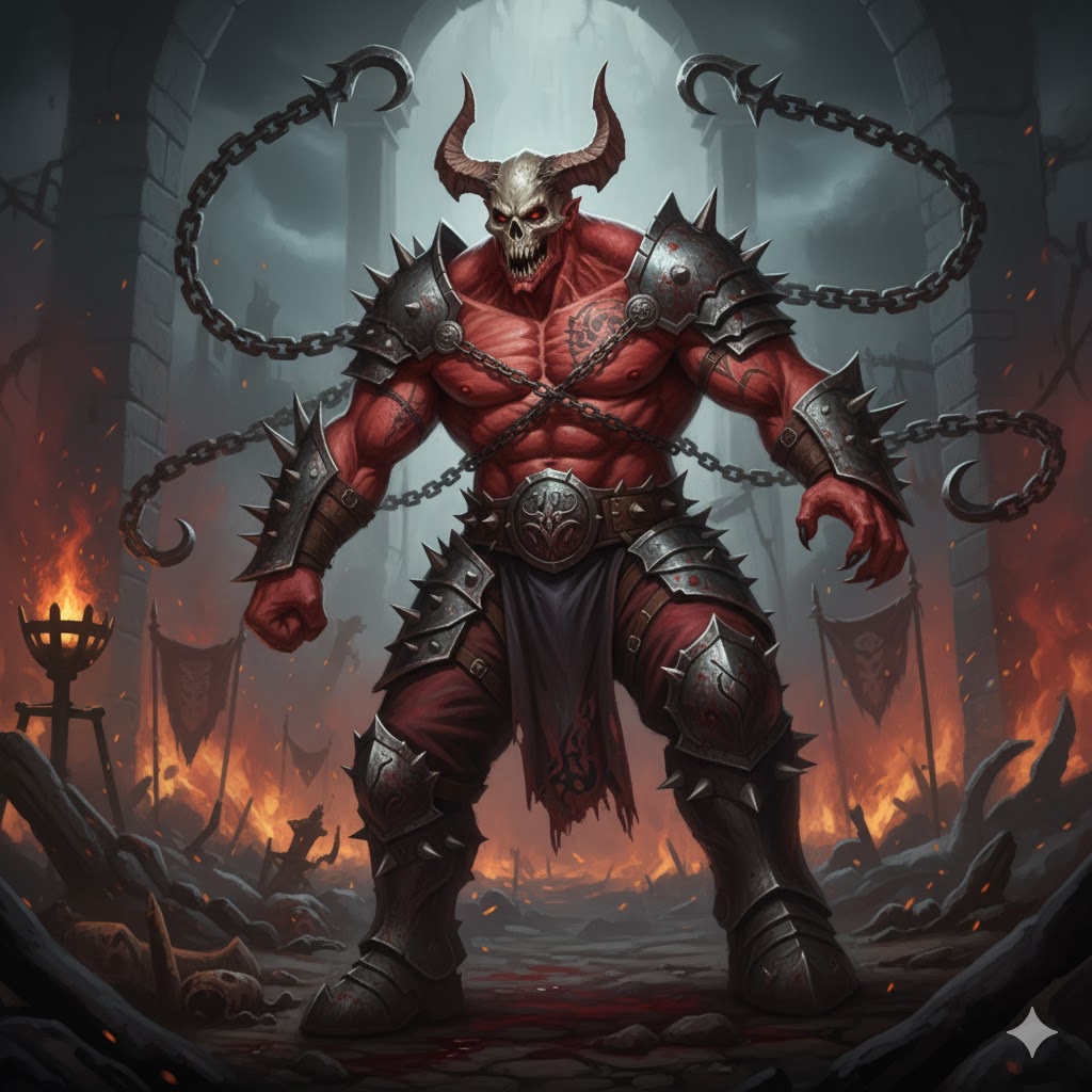As Garrok matured, he became aware of the exploitation faced by Rakdos performers in the Tenth District. The Azorius Senate targeted chaotic performers with excessive taxation, oppressive speech limitations, and selective enforcement of "decency laws." Performance permits were prohibitively expensive, and civic guards regularly confiscated equipment and earnings under thin pretexts. Garrok organized his fellow performers into an underground labor collective. What started as mutual aid evolved into sophisticated resistance. He coordinated performances that violated Azorius restrictions in ways that made the laws look absurd, staged protests that became street parties too large to disperse, and orchestrated "tax rebellions" where entire troupes vanished into the Undercity when collectors arrived. He trained performers in hit-and-run spectacle and established networks of safe houses throughout Ravnica's lower districts. When the Guild War erupted in 10,000 ZC, Garrok's organizational skills caught Lord Rakdos's attention. At age 30, he was elevated to general, commanding Rakdos forces in the wider conflict. For forty years, Garrok served at the demon lord's side, proving himself as both strategist and administrator. But as the war dragged on, Lord Rakdos fell into increasingly deep bouts of nihilistic depression. The demon lord would retreat to his lair for months at a time, leaving the guild leaderless while Garrok kept the Cult functioning—mediating disputes, managing supply lines, making tactical decisions, and holding together an organization that threatened to tear itself apart without direction. In 10,040 ZC, forty years into the war, Garrok and Lord Rakdos had an argument. Leading Garrok to step down from his position.Return to Performing and Family Life