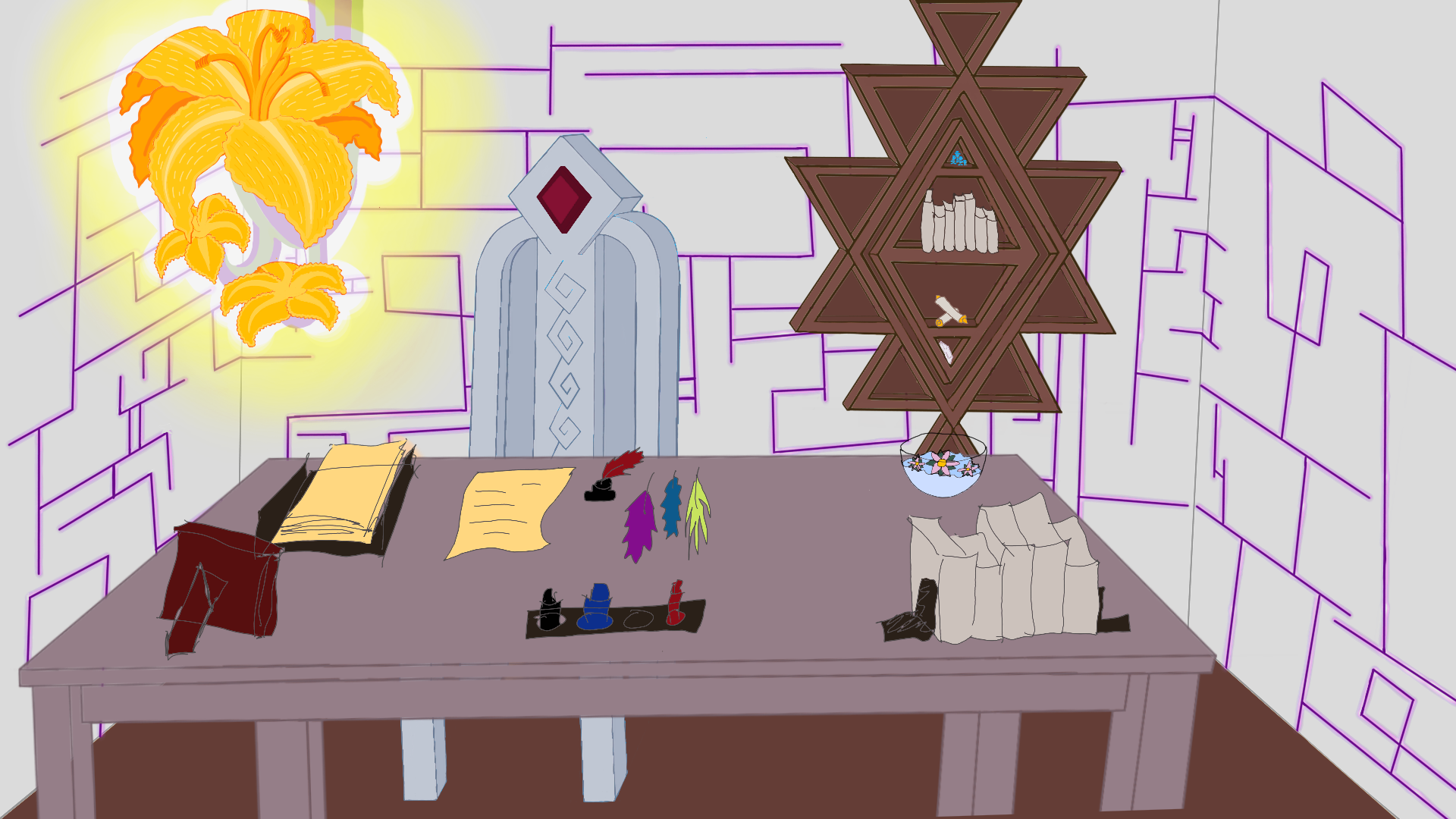 The ceiling and outer wall (the wall opposite the door, that does not attach to another room) are made of stone vine power cells, powering all the office electronics. The large Daylily in the corner lights up the room. The outer wall also has a window, that can be closed off with a wall section, in order to ensure any private meetings are kept completely confidential.