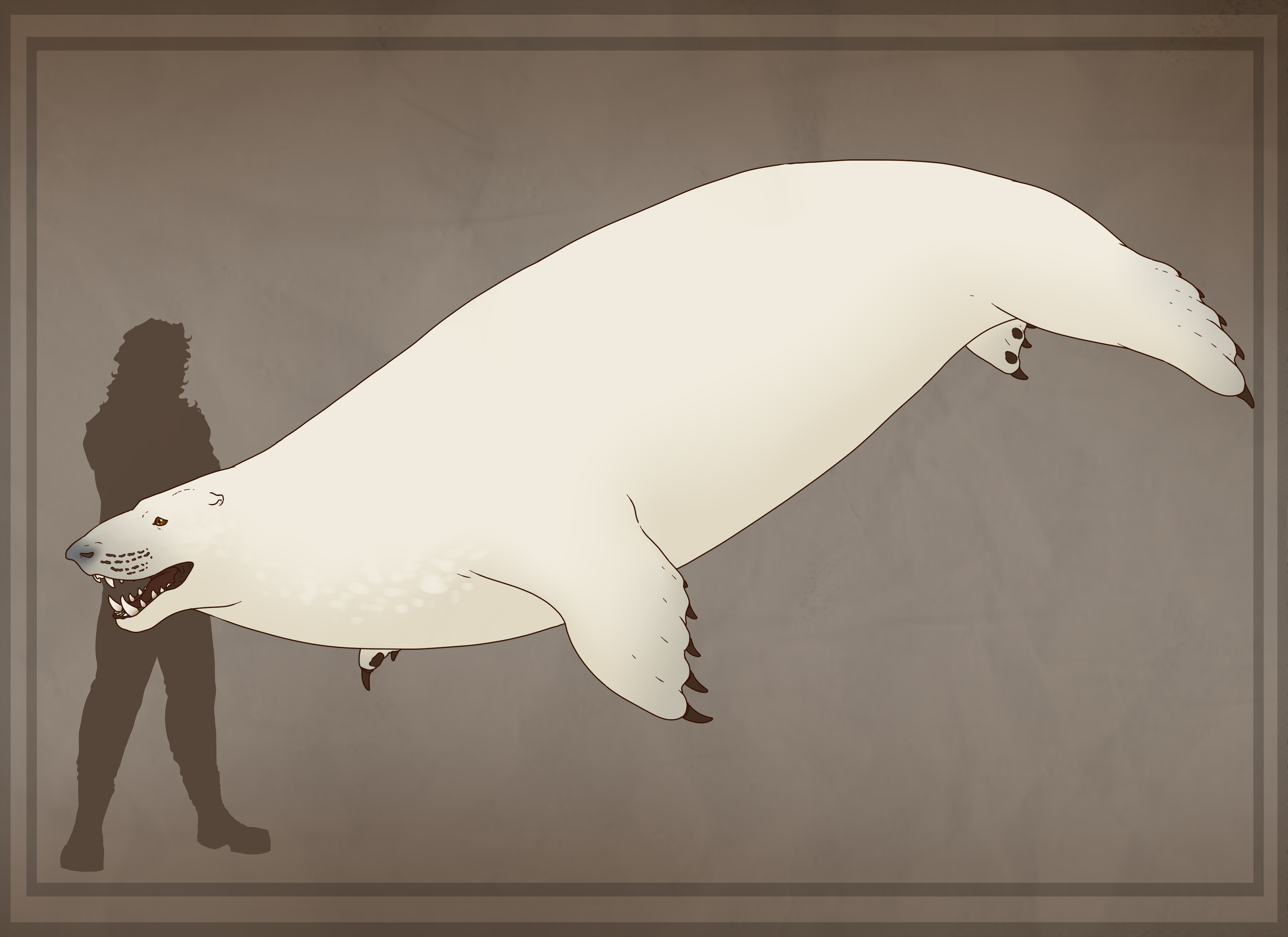 The Arctic Bear Seal looks in many ways, like a white leopard seal with a larger head and longer snout. They are typically between 12 and 15 feet long, with short, waterproof fur over their entire bodies that is actually translucent, and they have stark black skin with a thick layer of fat underneath. Bear seals have replaced their limbs with powerful clawed flippers that retain a high degree of mobility and ability to grip onto surfaces such as rocks and icebergs. Due to their incredibly powerful jaws, bear seals are capable of crushing bone easily, which is thought to be their primary method of hunting to dispatch large prey such as true seals, large fish, and young cetaceans.